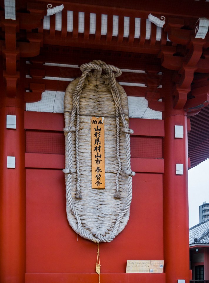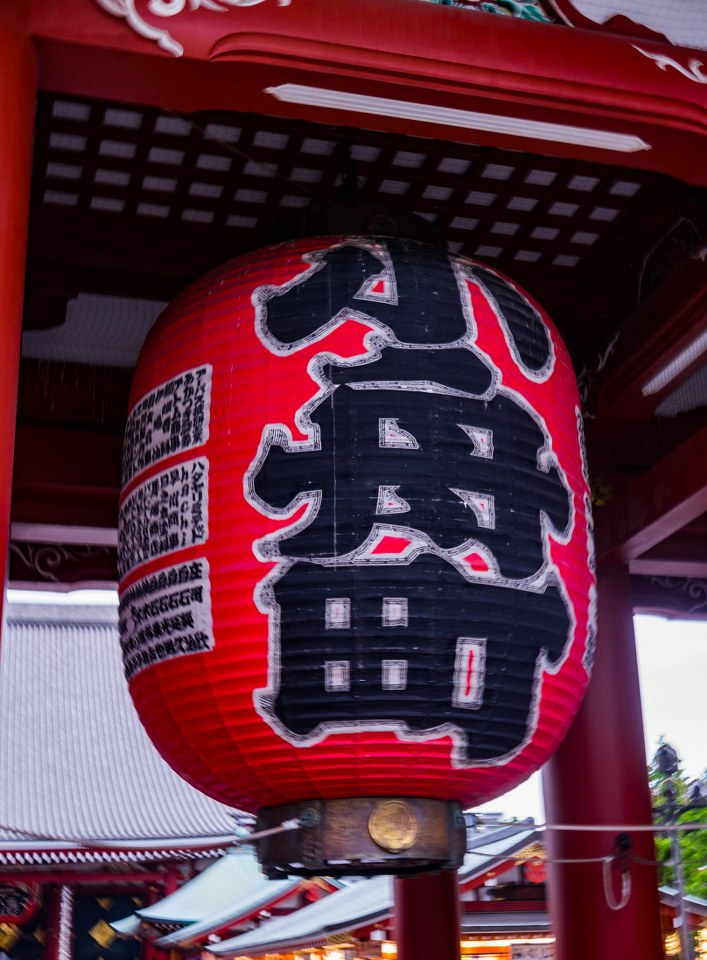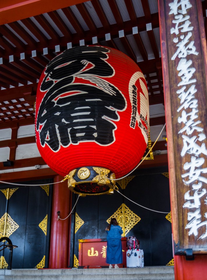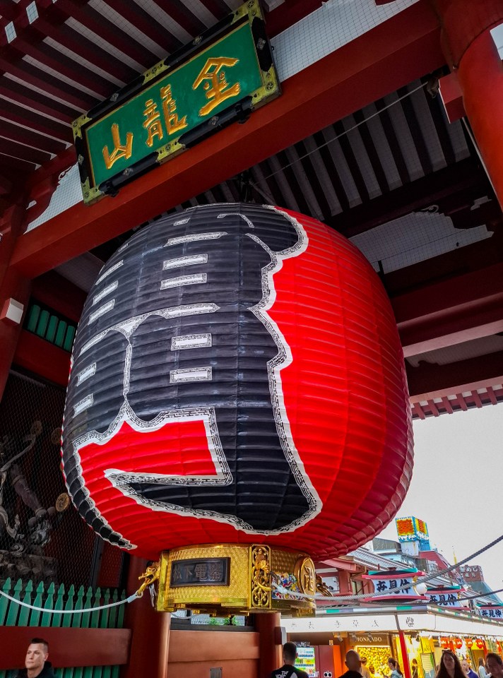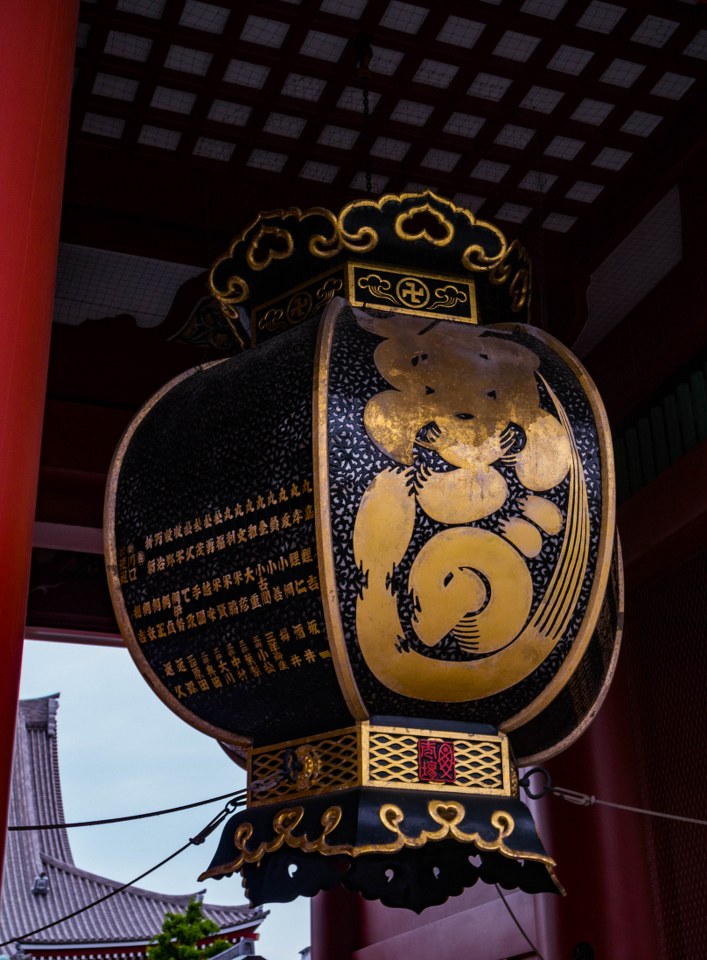 Brama pełna jest ciekawych motywów, obstawiona jest przez dwie rzeźbione pary boskich strażników (tak buddyjsko-smoczy Tenryu i Kinryu jak i shintoistyczni Raijin i Fujin władają domenami wiatru i burzy) doglądających jej z obu stron, ale wzrok wszystkich i tak skupia się na wielkim, prawie 4 metrowym lampionie. Obecny, ważący 700 kilogramów Chōchin ma zaledwie 12 lat, ale w ogóle nie widać po nim tremy – niewzruszony dzień w dzień służy za tło tysięcy zdjęć, będąc też jednym z tych elementów świątyni, które emanują dobrą energią i chce się przy nim być. Warto wtedy zajrzeć na spój lampionu 🙂 A po chwili zacisnąć zęby i ruszyć na spotkanie z rzeką ludzi. Albo i nie.