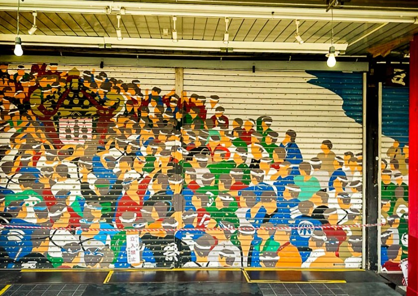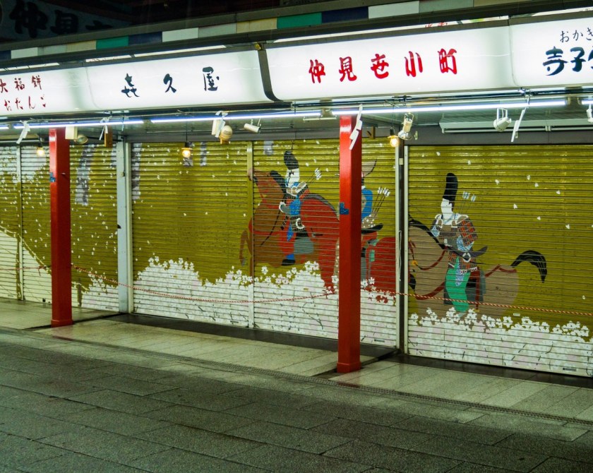 Rzeka ludzi przewalająca się przez ulicę trochę przerażała, dlatego chętnie odwiedziłem ją wieczorem. Sklepiki otwierane są o 9.00, zamykają się pomiędzy 17.00 a 18.30 i po tej godzinie traficie już raczej tylko na ostatnich sprzedawców, sprzątających swoje cztery kąty. Jednakowoż późna/wczesna wizyta pozwala na podziwianie całkiem ciekawego artystycznego konceptu – historii i zwyczajów Asakusy namalowanych na sklepowych żaluzjach. Grafiki nawiązujące do koncepcji emaki-mono, długich zwojów opowiadających pewną historię powstały przed niemal 40 laty, i wraz ze swym podłożem są diablo ciekawym i nieoczywistym nośnikiem miejscowego dziedzictwa. Zwoje przedstawiają tak najważniejsze święta, nawiązują też do estetyki drzeworytów z okresu Edo. Bardzo fajna rzecz.