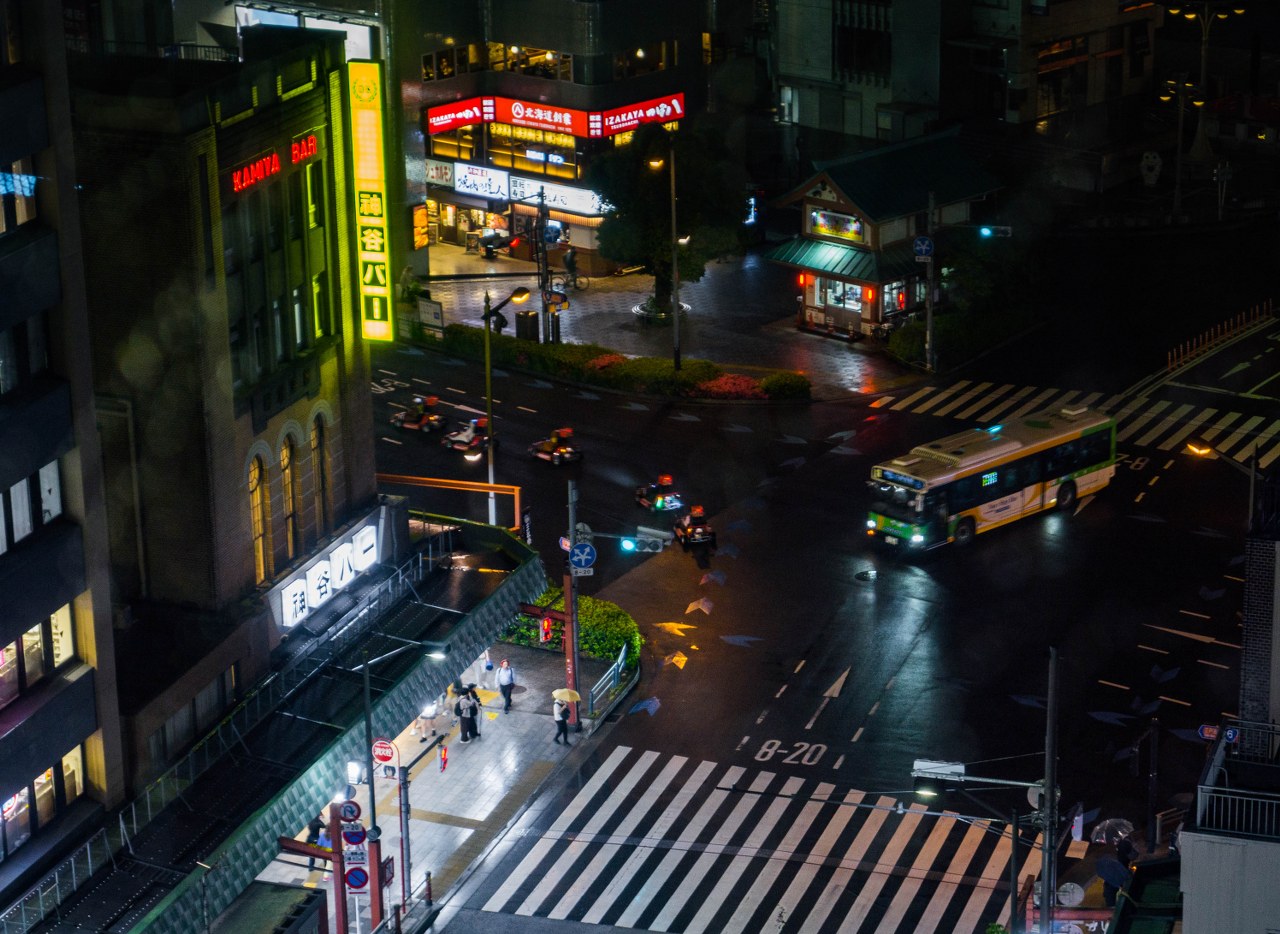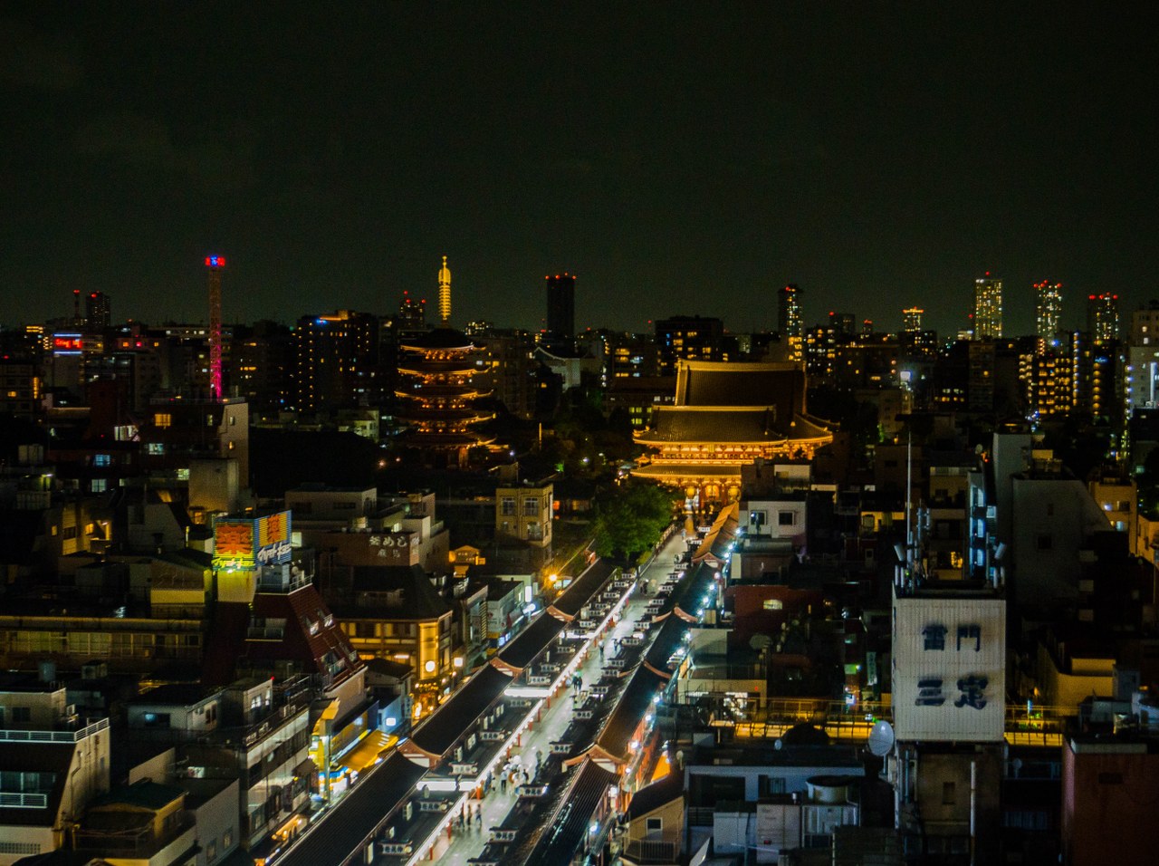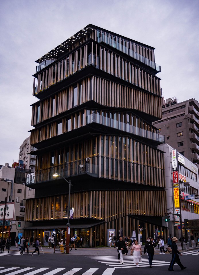 Dotarcie spod Parku Ueno (gdzie ostatnio się pożegnaliśmy) zabiera 8 minut. Tyle na przystanek Asakusa jedzie metro linii Ginza. Stacja znajduje się o rzut beretem od świątyni więc to chyba najlepsze miejsce skąd można rozpocząć spacer. Ale, ale, zanim ruszymy na spotkanie z czternastoma stuleciami historii wato zatrzymać się przy budynku Centrum Informacji Turystycznej (浅草文化観光センター). I to nie tylko z powodu diablo intrygującej, współczesnej architektury (Kengo Kuma, jeden z najbardziej znaczących, obecnych, japońskich architektów i jego oparte w dużej mierze na drewnie pomysły pozdrawiają), ale i po prostu praktycznie – wewnątrz dostać można np. mapki i ulotki o najbliższej okolicy. Przede wszystkim jednak warto wrócić tu po zmroku (wydaje mi się, że tak jest najlepiej), by na ósmym piętrze, z darmowego punktu widokowego pooglądać nie tylko kompleks świątynny. Punkt czynny jest od 9.00 do 22.00 a jakby ktoś chciał do widoków dodać kawkę i coś słodkiego to do 20.00 na tym samym piętrze czynna jest kawiarnia.