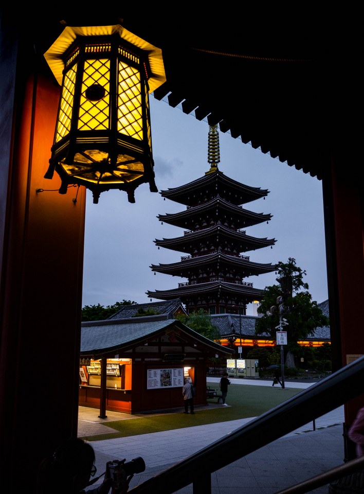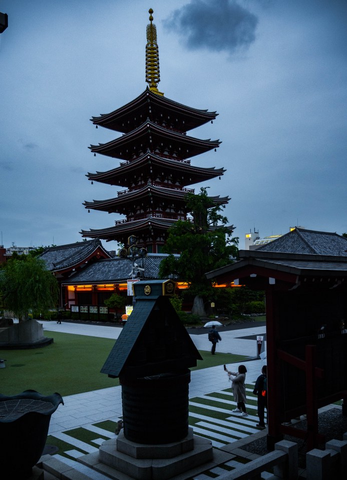 Po lewej stronie (przychodząc od Nakamisedori) bramy wznosi się przepiękna pięciopiętrowa pagoda, wraz z Hōzōmon tworząca chyba najbardziej emblematyczny i charakterystyczny dla świątyni widok – nocą szczególnie, oba budynki prezentują się nie-sa-mo-wi-cie i to tu spotkacie najwięcej osób rozstawiających statyw i czekających na swoje 5 sekund.