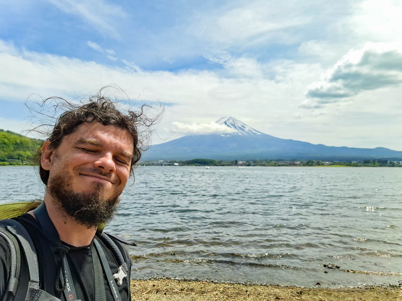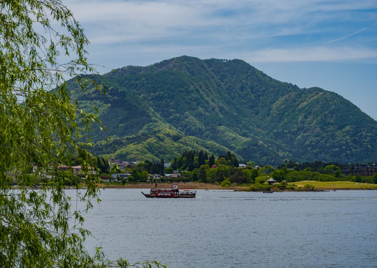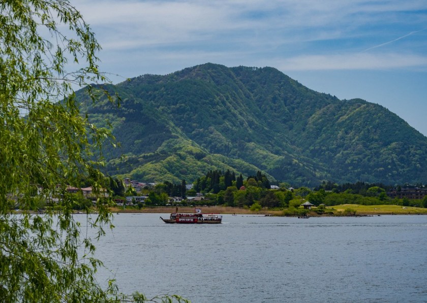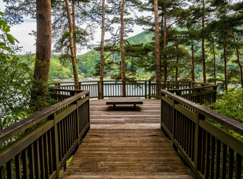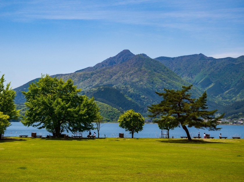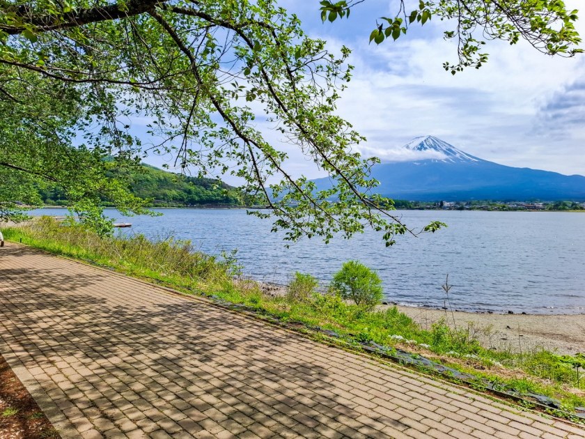 Most prowadzi na północny brzeg jeziora. To właśnie stąd widoki na Fuji-san są najbardziej imponujące. Stożkowaty wulkan to jednak tylko część wspaniałości, które można znad tej części jeziora podziwiać – wszystek zielonych wzgórz otaczających akwen robi nie gorsze wrażenie. A miejsc gdzie można zrobić postój jest tu tak naprawdę na pęczki.