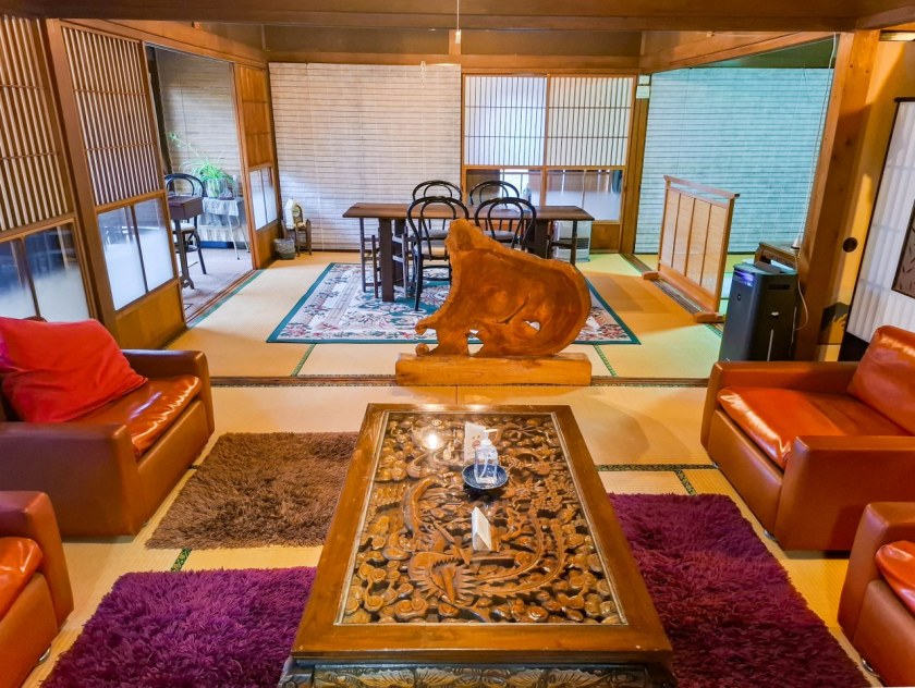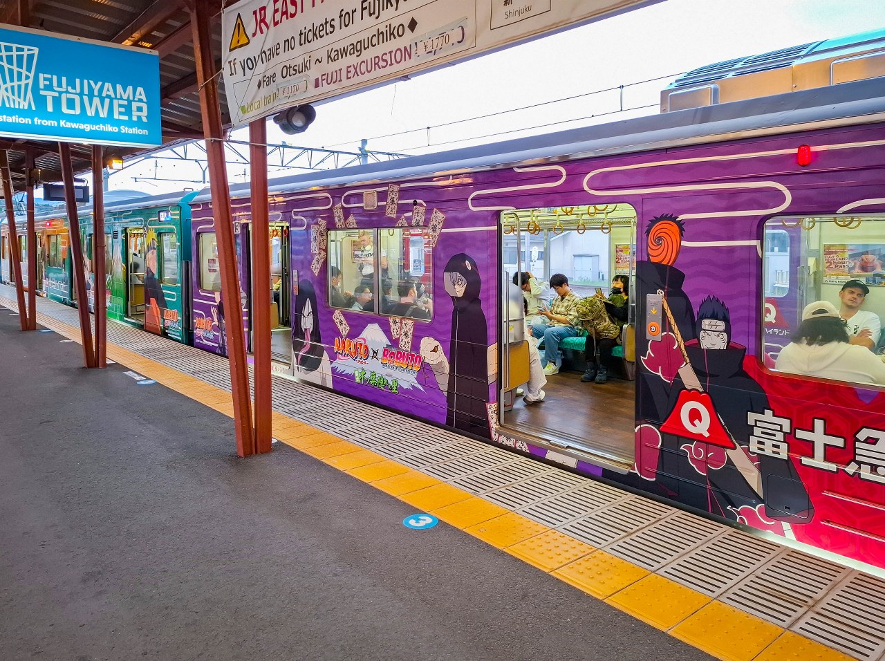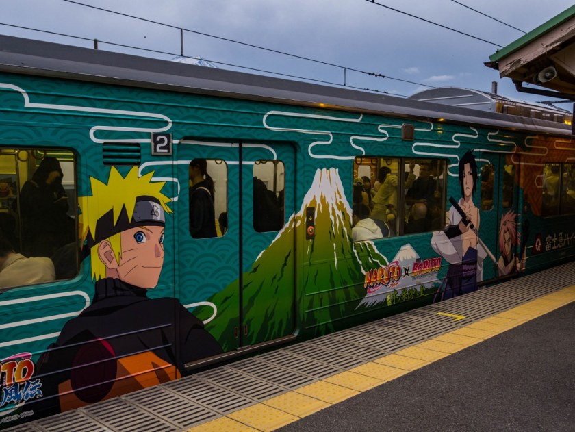Rower rowerem, ale wcześniej lepiej zrzucić plecak i zameldować się w guesthousie – wybrałem taki, oddalony od dworca o 5 minut spaceru. Bardzo fajny, w tradycyjnym domku z pokojem wyłożonym tatami, pięknym widokiem na ogród i całą kolekcją mangi Naruto 😀 Co zresztą nie dziwi bo okolica trochę z Naruto żyje – nieopodal (w sumie to zaraz przy następnym przystanku kolejki) znajduje się park rozrywki Fuji-Q Highland, którego duża część jest poświęcona popularnej serii. Nie trzeba jednak szukać tak daleko i jeszcze na dworcu kolejowym w Fujikawaguchiko spotkać można tematyczne ciuchcie kolejki Fujikyu, caluśkie (od zewnątrz, ale i wewnątrz) oklejone postaciami tak z Naruto jak i Boruto – no i powiem wam, że milusińskich z Akatsuki obserwujących każdy mój krok przy wsiadaniu do wagonu, to się nie spodziewałem 😀