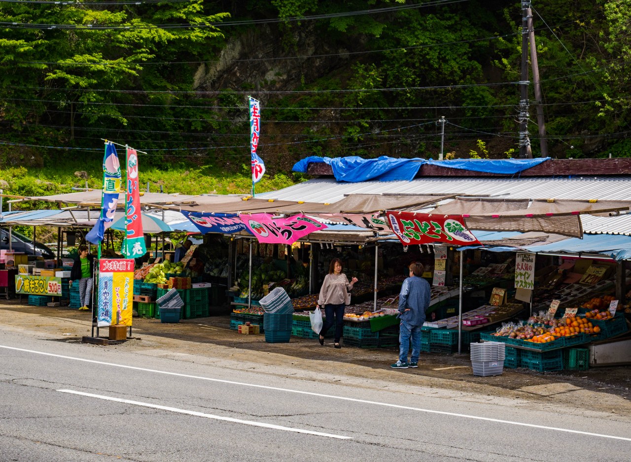 Zacząć można już przy zjeździe z mostu. Tuż przy a nawet pod przeprawą jest niewielka, kamienisto-skalista plaża (a wśród drzew skryta jest niewielka kapliczka Ubuyagasaki). Nieopodal niej, tuż przy drodze jeśli będziecie mieć szczęście traficie na miejscowych rolników. A trzeba przyznać, że owoce z prefektury Yamanashi są wybitne, inna rzecz, że podobnie jak w całej Japonii ich ceny potrafią sprawić ból. Nic to, koszyk w rowerze do czegoś przydać się musiał i truskawki zajęły wygodnie dla siebie kącik.