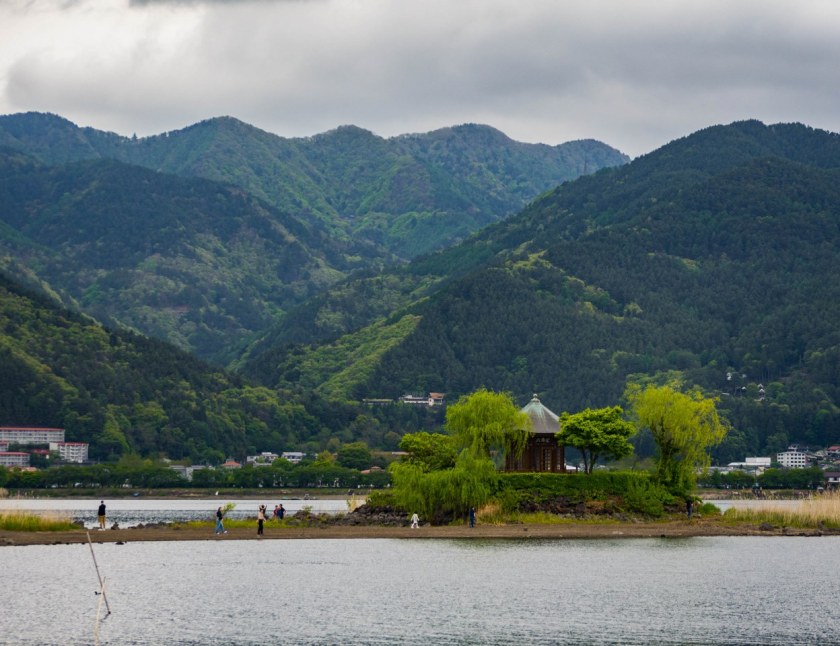 Nad południowy brzeg jeziora dotarłem już stosunkowo późno, do zdania roweru pozostało nawet nie 90 minut. Południowa część Kawaguchiko jest o wiele gęściej zabudowana niźli północna, dlatego też znalezienie miejsc gdzie spokojnie można się zatrzymać jest o wiele trudniejsze. Kilka parków się jednak znajdzie i wraz z coraz ciemniejszymi chmurami pozwalały one na podziwianie całkiem dramatycznych krajobrazów. Koumi Park na ten przykład, popularne miejsce pikników, tego dnia klimatem nawiązywał do skandynawskich kryminałów, pobliska marina sprawiała posępne wrażenie, do oddalonego, sześciobocznego pawilonu Rokkakudo śpieszyli spacerowicze korzystający z możliwości dojścia suchą stopą – pora deszczowa przyniesie opady i uczyni z niewielkiego skrawka ziemi wyspę.