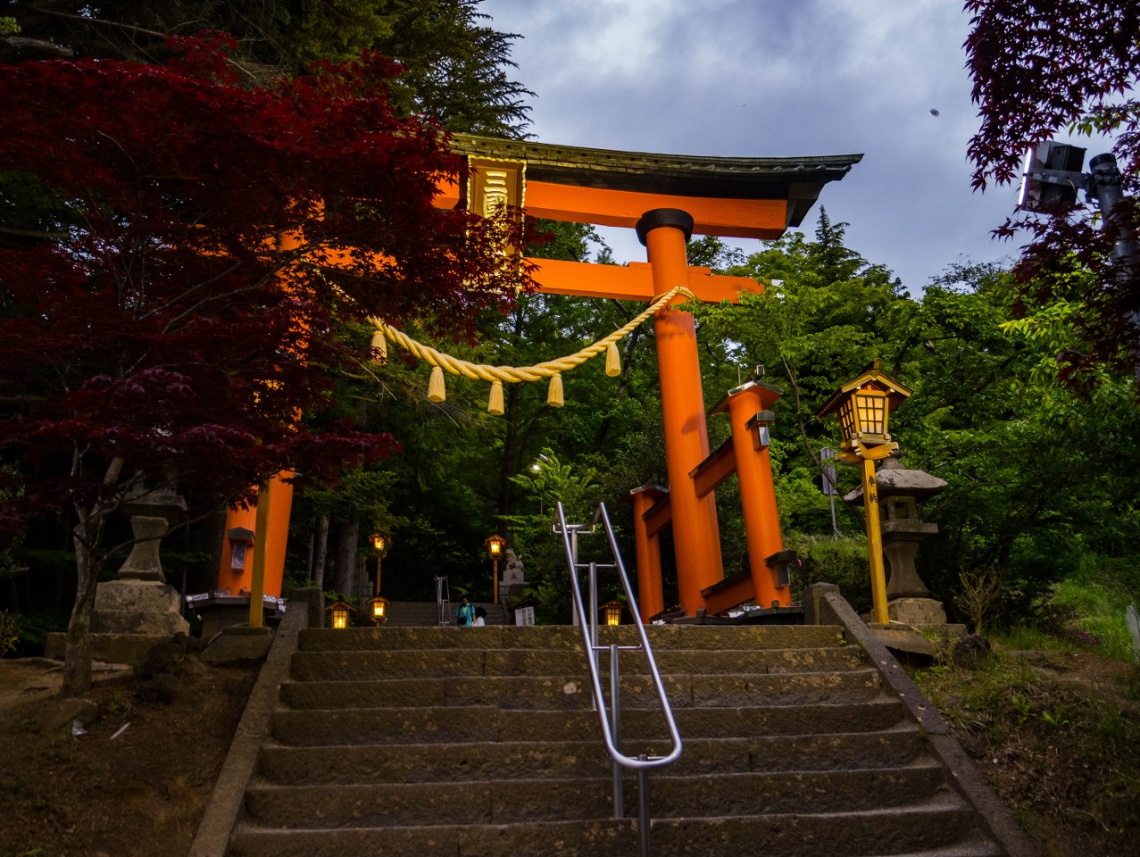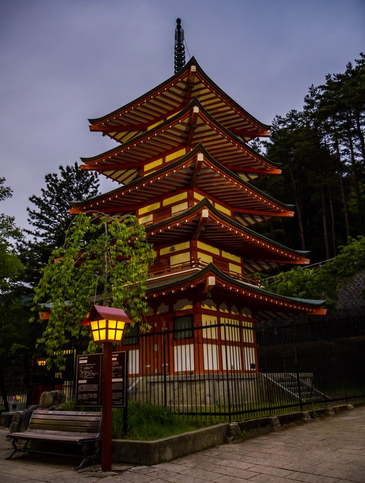 Wzgórze Arakura wysokie jest na 1184 metry, jednak większość odwiedzających wspina się na nie więcej niż metrów 900, osiągając finalnie platformę widokową, z której rozpościera się ten JEDEN widok, dla którego się tu przyjeżdża. Zgrywam się oczywiście, Arakurayama Sengen Park skrywa kilka fajnych miejsc, daje możliwość zrobienia dobrego cardio (do pokonania są 398 schody) a także stawia na naszej drodze kolejny, prastary chram. Arakura Fuji Sengen o zmierzchu prezentuje się niezwykle klimatycznie, pusty dziedziniec spowodowany późną godziną wręcz zachęca do krótkiego postoju. Podobnie jak poprzednio wspomniany chram w Fujikawaguchiko, i ten należy do chramów Sengen, poświęconych Konohanasakuya-hime i górze Fuji – w całej Japonii znajdziecie około 1300 takich miejsc kultu.