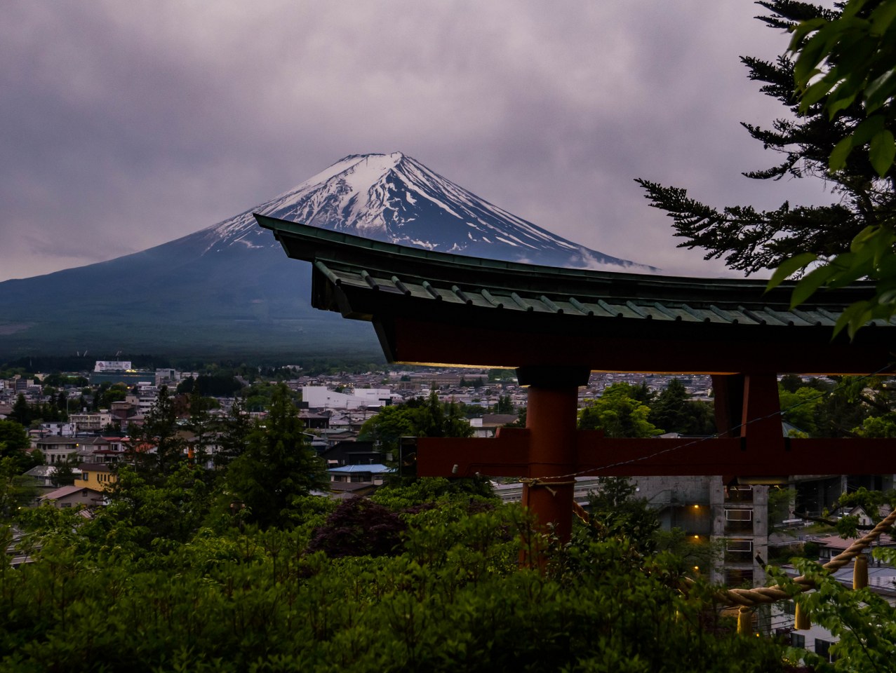Późnym popołudniem, po zdaniu już roweru charakterystyczny stożek w końcu schował się za chmurami. Mimo to postanowiłem zaryzykować i podjechać na stację Shimoyoshida, skąd żabi skok do najsłynniejszej chyba miejscówki oferującej podziwianie Fuji-san. A co tam, może się przejaśni?