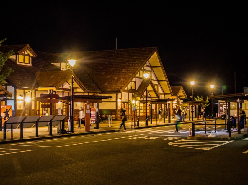 Dworzec w Kawaguchiko również i nocą (a może tym bardziej) prezentował się zjawiskowo, skorzystałem też szybko z okazji i rzuciłem okiem na rozkład autobusów – kolejny dzień zacząć miał się dość wcześnie od autobusu właśnie, do Kofu, skąd pociągiem dotrzeć miałem do Matsumoto.