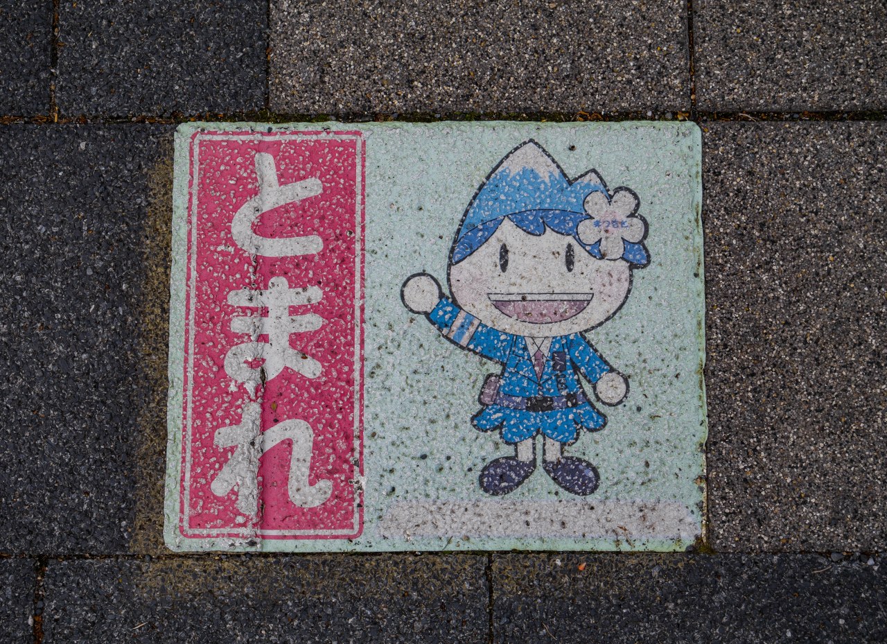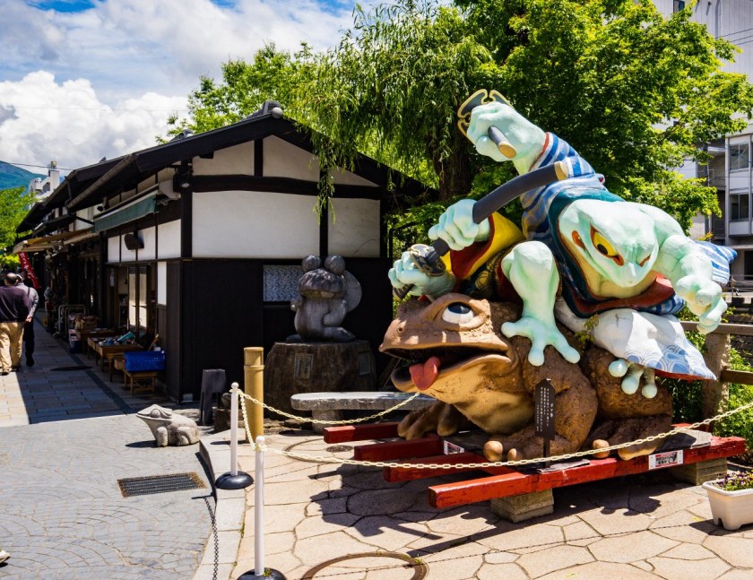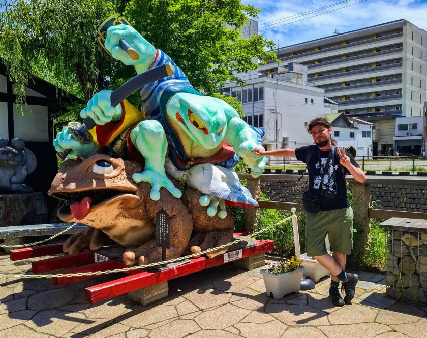 Jeszcze w ubiegłym wieku Metoba była domem dla niezliczonych żab z rodziny kajika. Była. Niestety, potężne siły natury (w postaci tajfunu) w tandemie z potęgą ludzkich zaniedbań doprowadziły do znacznego zanieczyszczenia rzeki i wymarcia całej populacji. W roku 1972 mieszkańcy ufundowali niewielki chram, (a raczej kapliczkę) Kaeru Daimyōjin. Poświęcony sympatycznym płazom chram, jest wyrazem nadziei na ich powrót, ten jednak wciąż nie nastąpił. W każdym razie nie dosłownie, bo Metoba może i wciąż na kajika-kaeru czeka, ale ciągnąca się wzdłuż rzeki uliczka Nawate takiej cierpliwości nie miała i słynie dziś z niezliczonych żabich rzeźb: malutkich, symbolicznych jak i całkiem sporych, iście mangowych! Żabia symbolika wybrzmiewa w każdym sklepiku, tak z pamiątkami jak i słodyczami. I jest to świetna sprawa, życzę miejscowym by kiedyś, i żabi rechot ponownie dał się tu słyszeć.