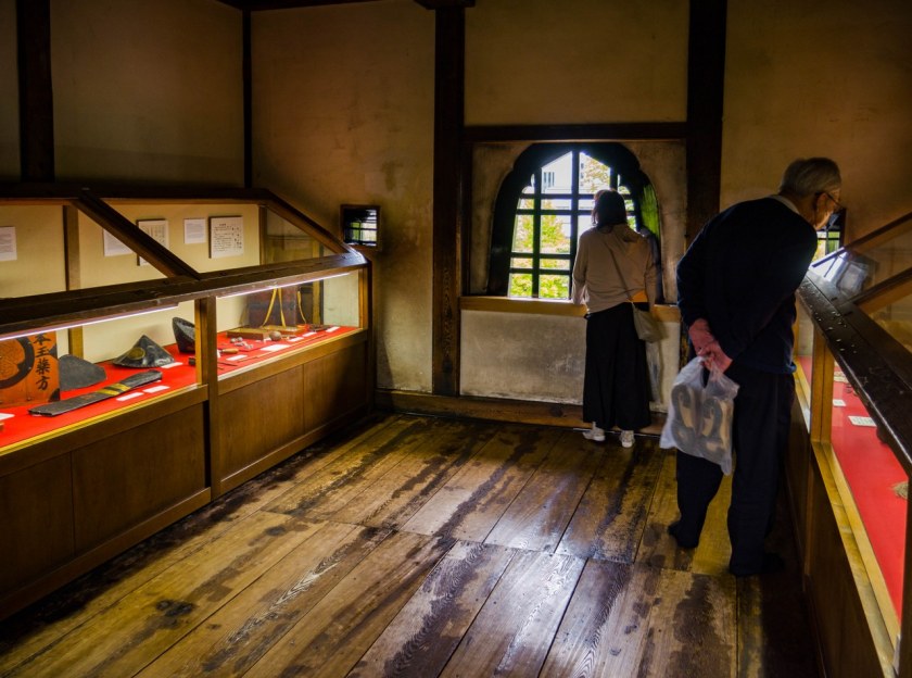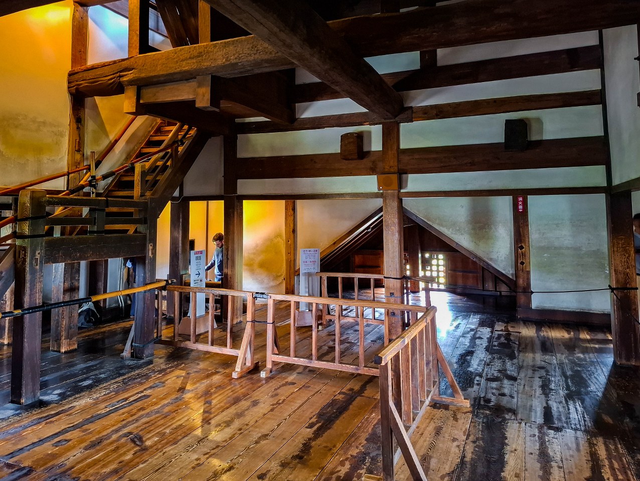 Zwiedzanie zamkowych wnętrz jest jedną z nielicznych, niepowtarzalnych okazji doświadczenia ich klasycznej formy – tak innej od powojennych rekonstrukcji, nierzadko całkowicie pozbawiających zamki klimatu. Pięć (choć wszyscy wiedzą, że sześć) pięter głównej wieży, kilka poziomów pozostałych baszt zwiedza się na bosaka, buty chowając w siatce (lub plecaku jak się ma). Ach, czuć tę historię, drewniana, niekiedy wyślizgana podłoga skrzypi pod nogami, na kolejne piętra prowadzą wąskie i strome schody (te łączące czwarte i piąte piętro to niemal drabina, nachylenie 61 stopni pozdrawia!) a wraz z wysokością, z niewielkich strzelniczych okien coraz lepiej widać jak karkołomnym musiało być oblężenie takiego zamku. Na pierwszych piętrach, wzdłuż wąskich korytarzyków znajdziecie wystawy broni, zbroi, ceramiki, monet, poznacie historię zamku. Wyższe piętra, o wiele bardziej surowe ale i przestrzenne służyły panu zamku a w razie oblężenia odbywać się miały tam narady – okazji ku temu zbyt wiele nie było, ale nas najbardziej powinno interesować to, że widok z najwyższych pięter jest niczego sobie i już dla niego warto się tu wdrapać.