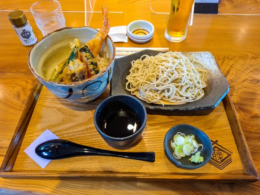 Uff, po takim dość intensywnym zamkozwiedzanku najlepszym co można zrobić jest szamanko! Matsumoto jak i cała prefektura Nagano są domem pysznego, delikatnego gryczanego makaronu soba. W mieście znajdziecie dziesiątki lokali gdzie sobę zjecie, w kilku będziecie mogli wziąć udział w warsztatach i sami zrobicie sobie makaron a w październiku przy szczęściu traficie na makaronowy festiwal. W okolicy zamku znajdziecie co najmniej kilka fajnych lokali. Jednym z nich jest Shinshu Soba Yamato, już z poziomu ulicy i krótkiej kolejki lokalsów dający nadzieję na dobre co nieco. W menu klasycznie, soba w opcjach na ciepło i zimno, w różnych wariacjach: z kaczką, tartymi pyrkami yamaimo czy krewetką w tempurze. Wersja na zimno, zaru soba chodziła za mną od dawno i o rety, kapitalne to jest! A jakże proste: mamy makaron, czarkę z sosem tsuyu (na bazie sosu sojowego, mirinu i rybnego bulionu dashi) do tego dodatki w postaci, pora, cebulki, wasabi oraz dyni i krewetki w tempurze. Małe dodatki lądują w tsuyu, w którym maczamy makaron i z głośnym „Siooooorb” wciągamy do paszczy 😀 Tak proste a pyszne, jakby to powiedział cesarz Robert, esencjonalne! A jeśli zostanie wam sosu to można go zalać gorącą wodą i na odchodne ma się łyk zupy 🙂 Super rzecz.