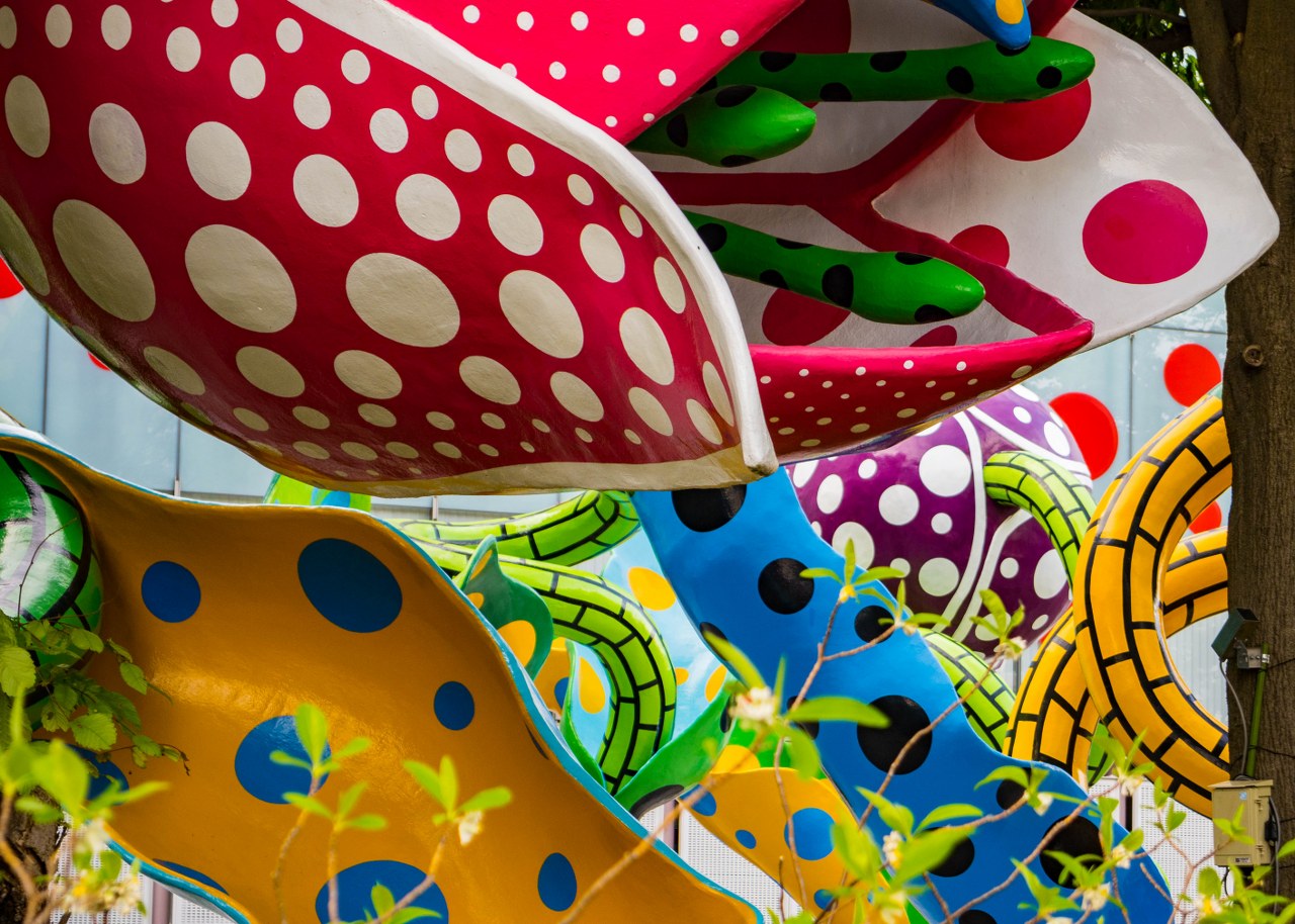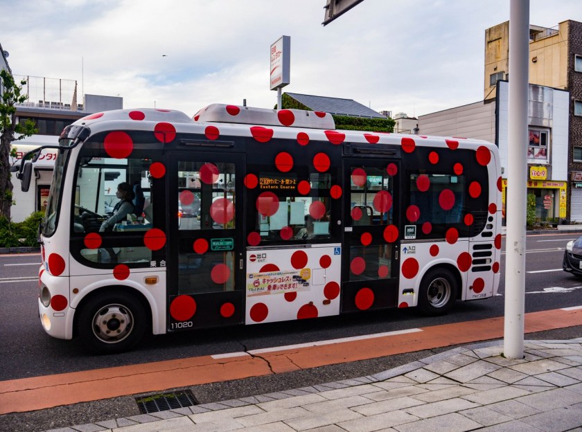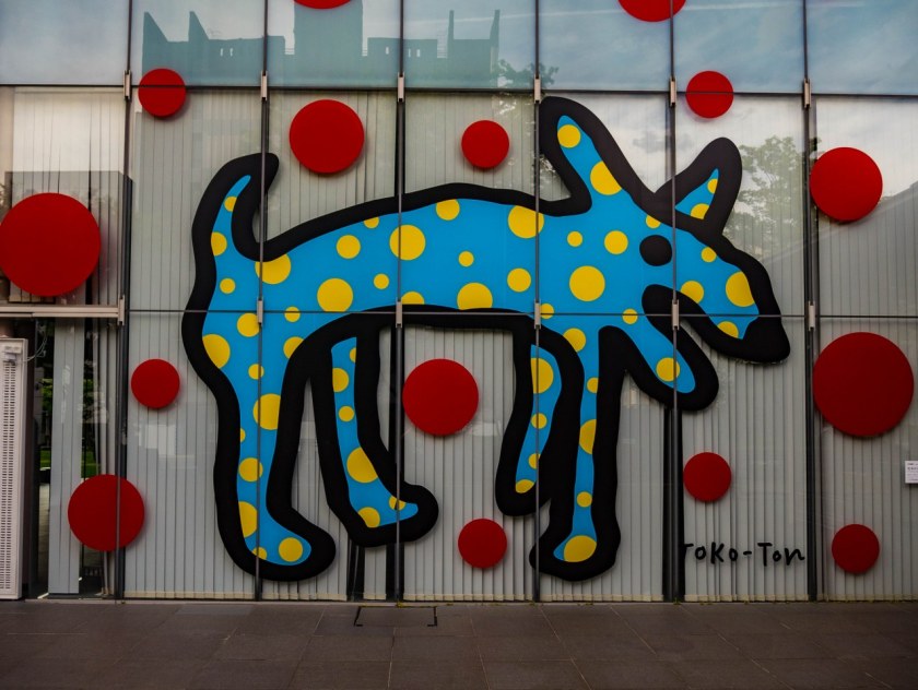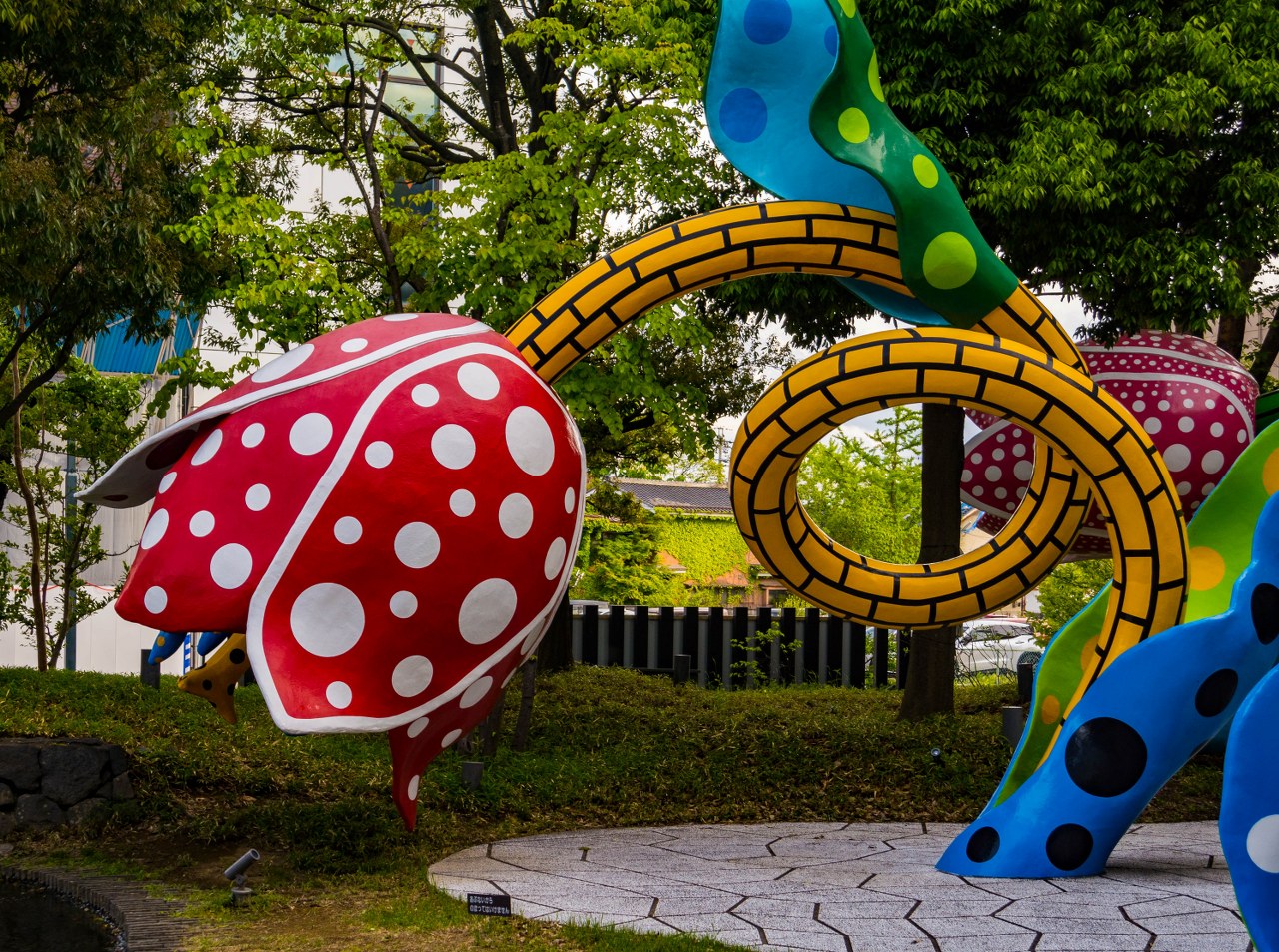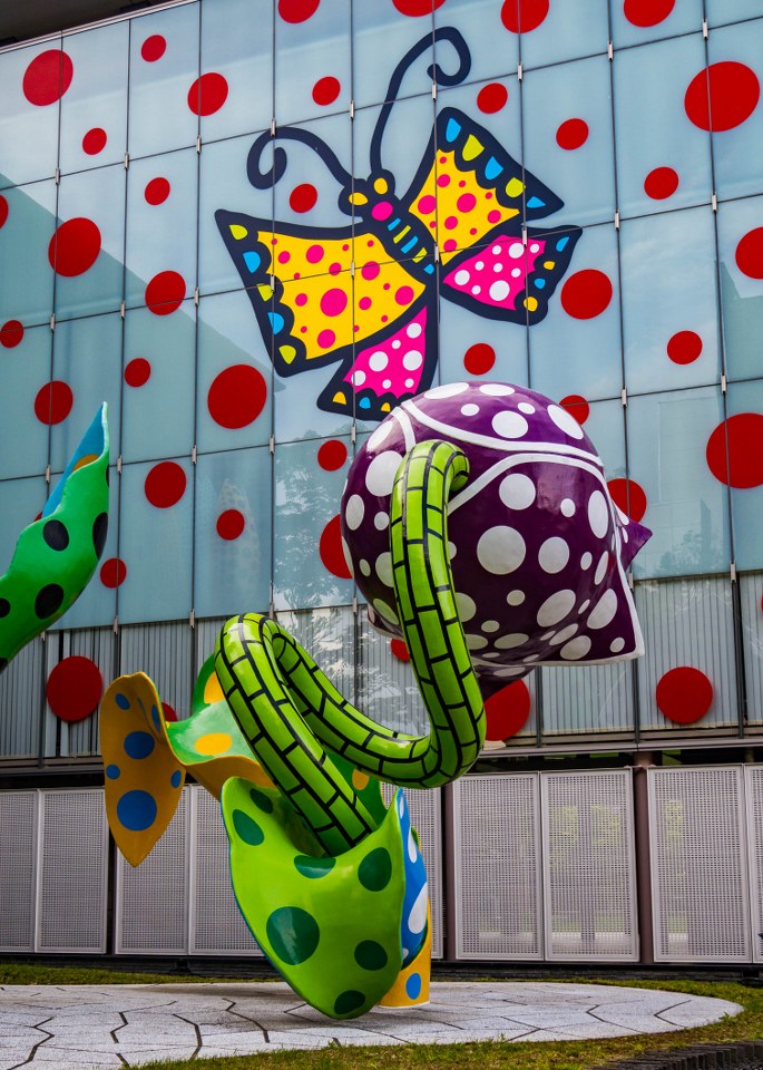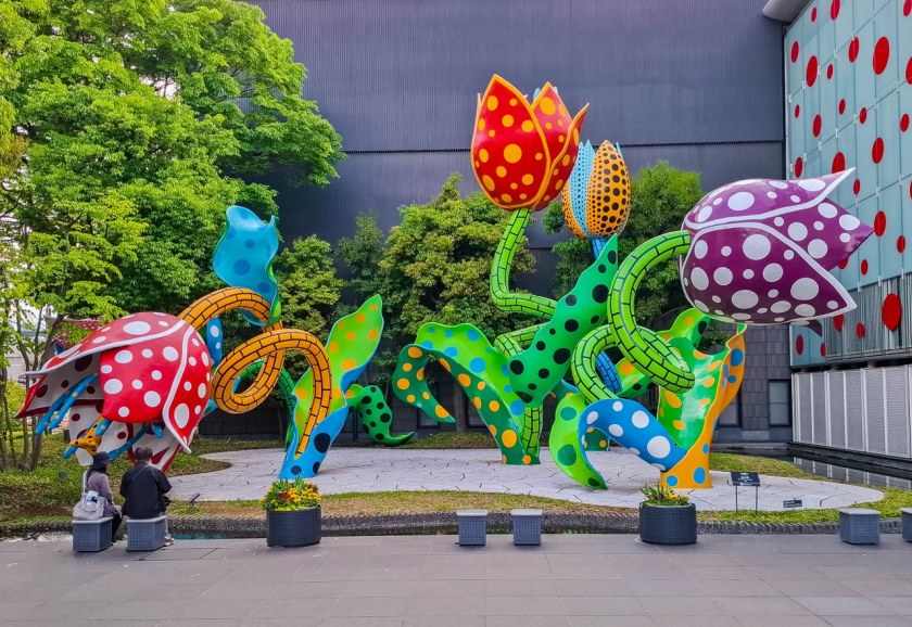 Kusama przyszła na świat w Matusmoto i nie ma się co dziwić, że w mieście znajduje się poświęcone jej muzeum. Oczywiście, jako geniusz, na spacer doń wybrałem poniedziałek a jak wiemy muzea nie lubią poniedziałków i jedyne co mi zostało to pocałować klamkę. Na szczęście sam budynek jest w pewnym sensie planszą z jej dziełami a na placu przed muzeum znajduje się instalacja, „The Visionary Flowers”. I choć kwiaty w świecie Kusamy mają duże znaczenie, nierzadko stawiając naprzeciw sobie życie i śmierć, tworzenie ze zniszczeniem to myślę, że każdy sam odpowie sobie na pytanie co widzi i czuje patrząc na poskręcane, pełne kropek rośliny.