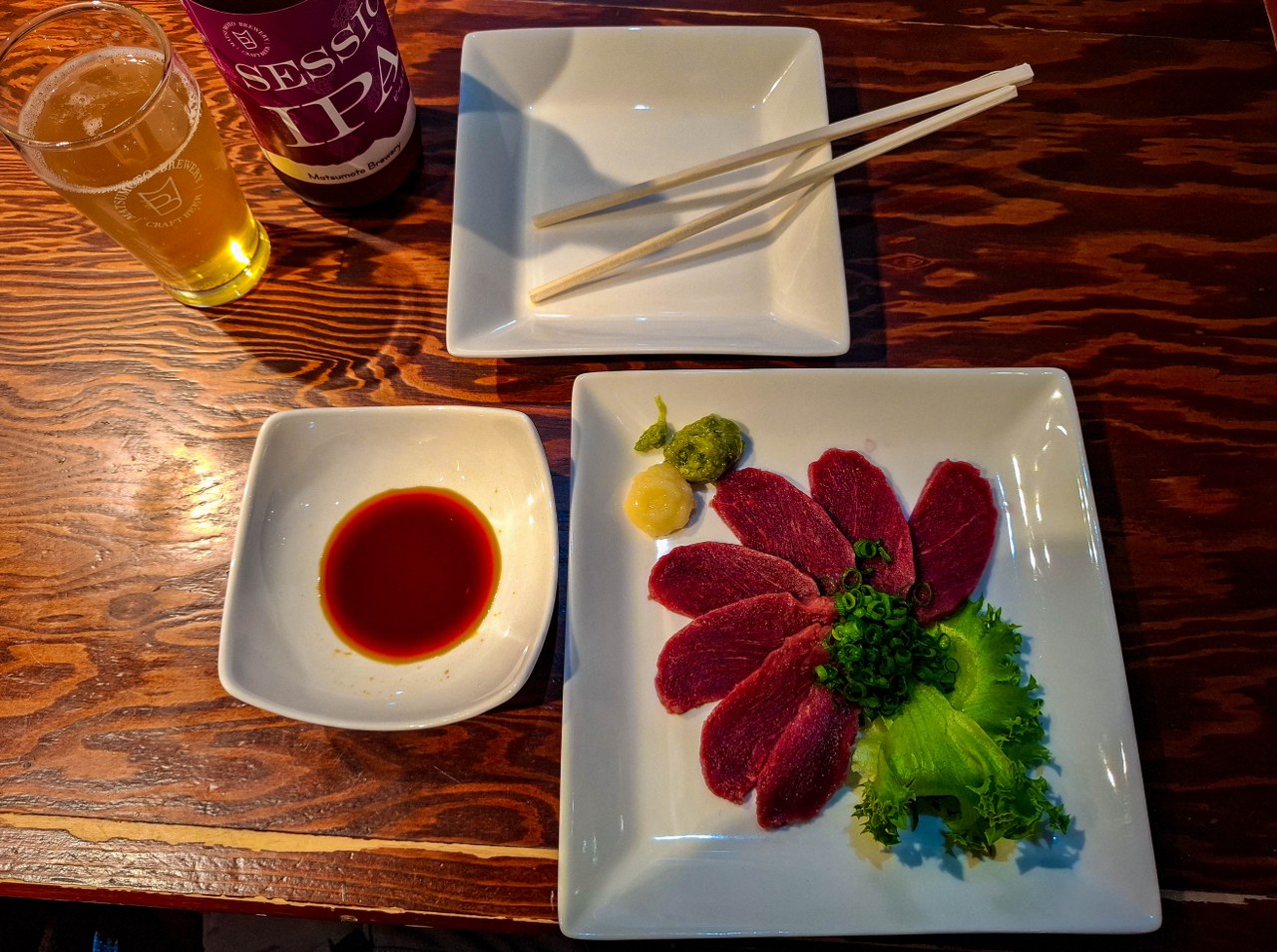 Będąc w Matsumoto musiałem jednak spróbować jeszcze jednej, diablo lokalnej rzeczy. Basashi (馬刺し) czyli surowa… konina, specjalność prefektury Kumamoto, ale rzecz niezwykle popularna w prefekturze Nagano. Rzecz podawana w formie sashimi, plastrów surowego mięsa w akompaniamencie tartego imbiru, wasabi i sosu sojowego. Co mnie podkusiło by spróbować konia i czy nie miałem z tym problemu? No nie miałem, konie – niezależnie od tego, że są zwierzętami o niezwykłej naturze – w odróżnieniu do psów czy kotów, zawsze traktowałem jako takie, które mogą też służyć… no do konsumpcji (choć raczej stawiałem je na końcu kolejki), wszakże w Polsce konina była i wciąż jest dostępna (choć raczej dość rzadko) a i nasz kraj jest jednym z większych eksporterów koni rzeźnych w Europie. No nie wiem, jakoś tam naturalnie konina nie wydawała mi się mięsem wokół, którego powinno powstać jakieś tabu – totalnie jednak rozumiem, że dla wielu choćby spróbowanie takiego mięsa to za dużo. Wiecie, sam mając okazję chciałem zobaczyć jakie jest bo nie wiem kiedy (czy) spróbuję go ponownie. W każdym razie basashi w takiej formie jak podaje się je w Japonii jest niezwykle pyszne, delikatne, rozpływające się w ustach. Lokali z basashi znajdziecie w mieście bez liku, jak spróbowałem w miejscu o nazwie Meat & Wine nieopodal dworca, w lokalu gwarnym, ale fajnym, składającym się z kilku mniejszych oferujących różne jedzonko.