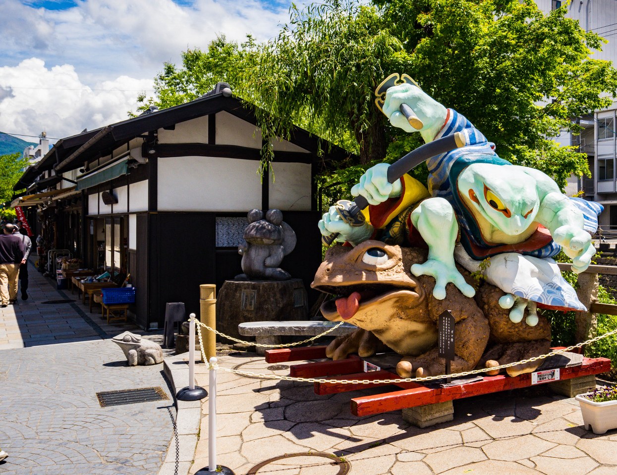 Co językowo intrygujące uliczka bywa nazywana Kaeru-michi. Michi odpowiada drodze, ulicy, ale słowo kaeru (przy niuansach w zapisie) oznaczać może tak żabę, powrót do domu jak i móc kupić – w tym kontekście historia tak sklepików, pielgrzymów oraz miejscowych żab nabiera dodatkowych rumieńców.
