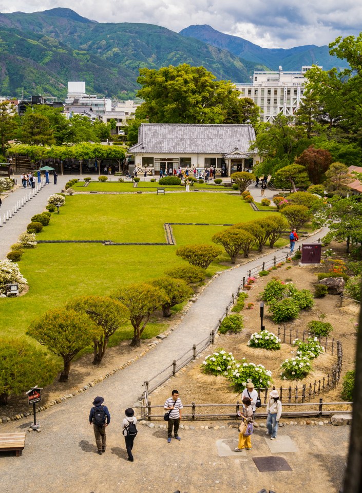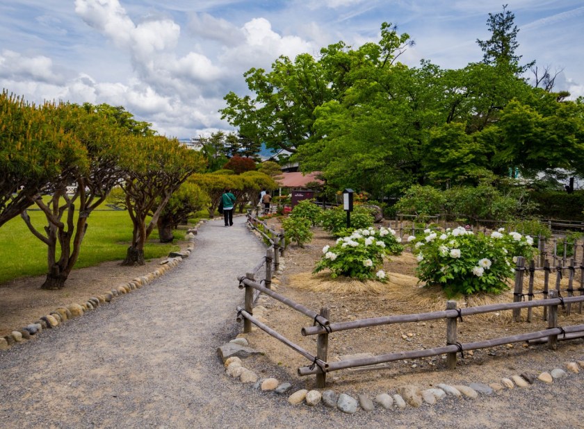 Ścieżkę do zamku przecina plac pełen idealnie przystrzyżonych drzewek ogrodowych jak i pozostawionych bardziej samopas wiśni. Tuż przed warownią, przy dużej dozie szczęścia spotkacie samuraja, ninję bądź też zbłąkanego szlachcica – to Omotenashi Squad, grupka zawsze chętna do zrobienia sobie z nimi zdjęcia. Prócz nich trafić też możecie na jednego z wielu wolontariuszy (często w wieku senioralnym), którzy zrobią co w ich mocy by pomóc.