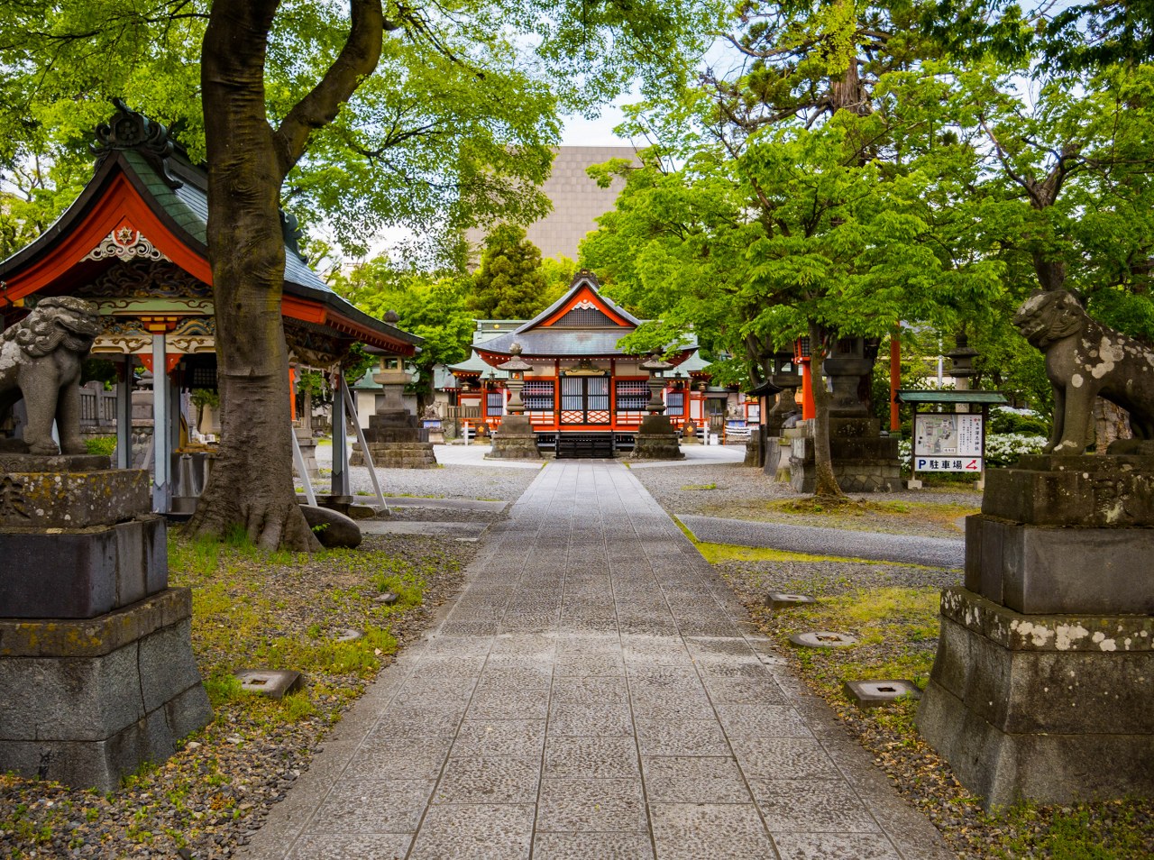Shintoistyczny chram nosi nazwę Fukashi-jinja i już samo to powinno nas zainteresować – Fukashi jest bowiem historyczną nazwą dla miasta powstałego wokół zamku. Chram założono jeszcze w XIV wieku poświęcając go bóstwu wojny Takeminakatatomi-no-mikoto, jego fundator Sadamune Ogasawara, ówczesny władca najbliższej okolicy, w ten sposób chciał uczcić upadek siogunatu Kamakura. O jego randze i silnych powiązaniach z okolicznymi władcami niech świadczy fakt, że wraz z budową zamku pierwotna nazwa Miyamura Daimyojin ustąpiła miejsca tej z warownią bezpośrednio związanej.