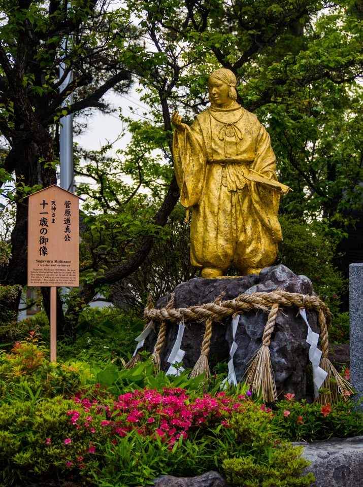 Kompleks jest niewielki, ale bardzo okazały, w popołudnie niemal pusty, zresztą Pawilon Główny był już zamknięty i jedyne co pozostawało to spacer między budynkami, kapliczkami i intrygującymi rzeźbami – w chramie jako kami czczony jest m.in. Michizane Sugawara, dość znacząca postać z okresu Heian, polityk, ale i poeta, kaligraf. Najciekawsze były jednak poszczególne budynki, niby wedle klasycznego wzoru a jednak ich malowanie sprawiało, że przystawało się na dłuższą chwilę. Bardzo fajne, kontemplacyjne miejsce.