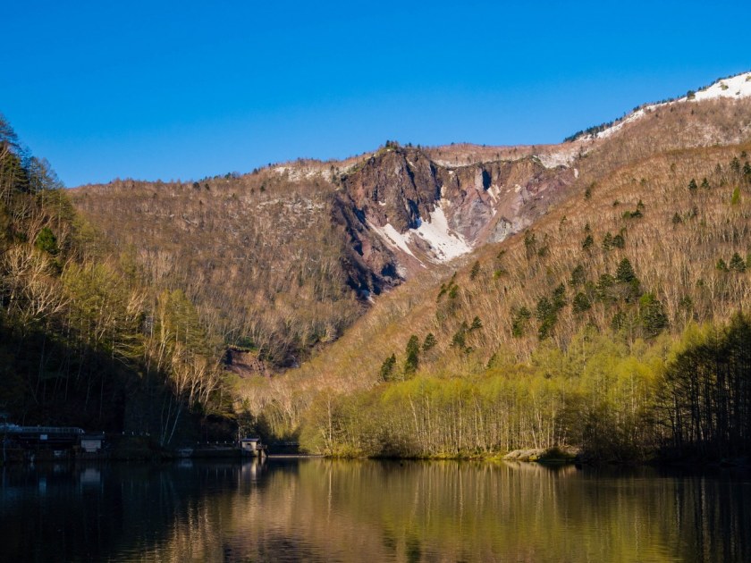 Staw Taisho służyć może za lustro, jednym z pięknie odbijających się w nim pagórów jest Yakedake, gagatek bez którego tak naprawdę nie odbywałby się ten spacer. Yakedake jest bowiem wulkanem i kilkanaście tysięcy lat temu, swymi wulkanicznymi ekscesami ukształtował znaczną część koryta Azusy, wprowadzając ją na salony, pomiędzy górskie szczyty. Co więcej, niewiele ponad sto lat temu, ponowna erupcja doprowadziła do spiętrzenia się rzeki i powstania stawu, tego nad którym stoimy. Po latach efekt katastrofy postanowiono wykorzystać i po dziś dzień staw ma również funkcję publiczną, służąc za zbiornik nieodległej elektrowni wodnej.