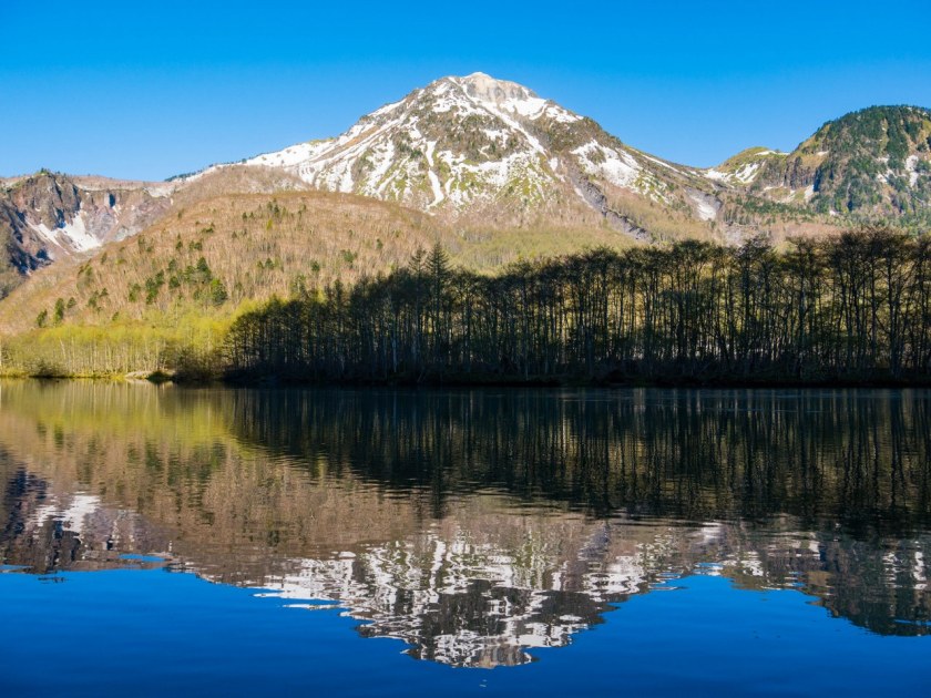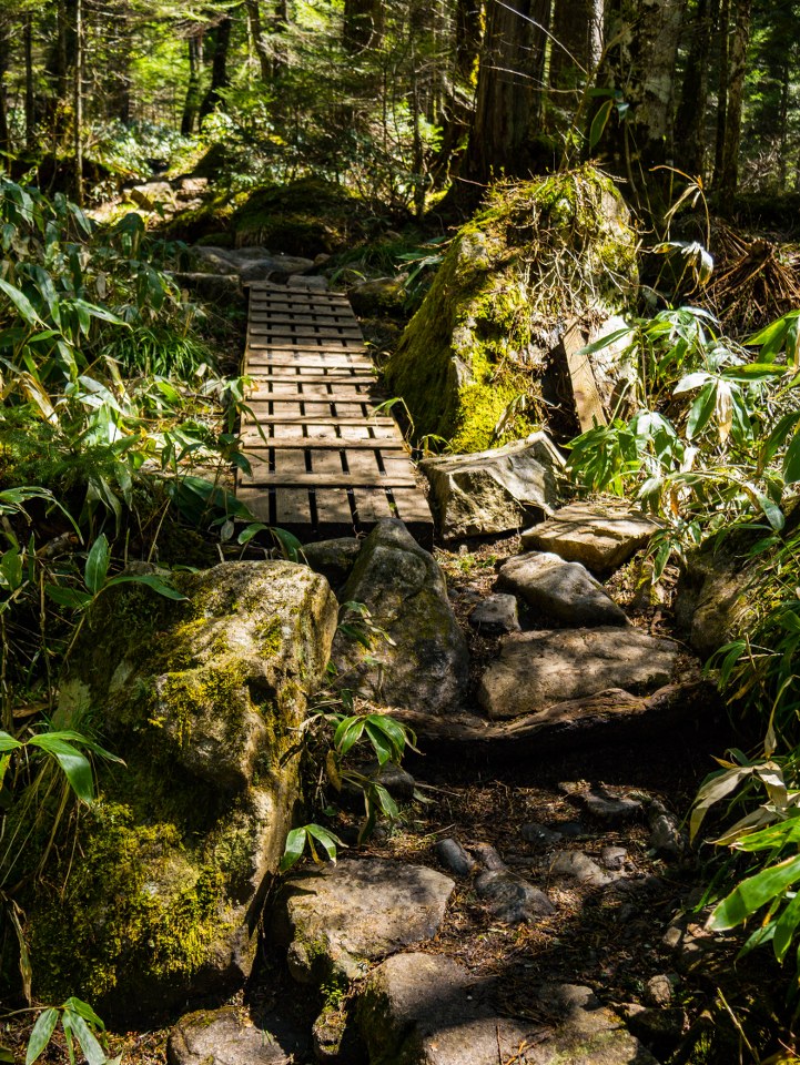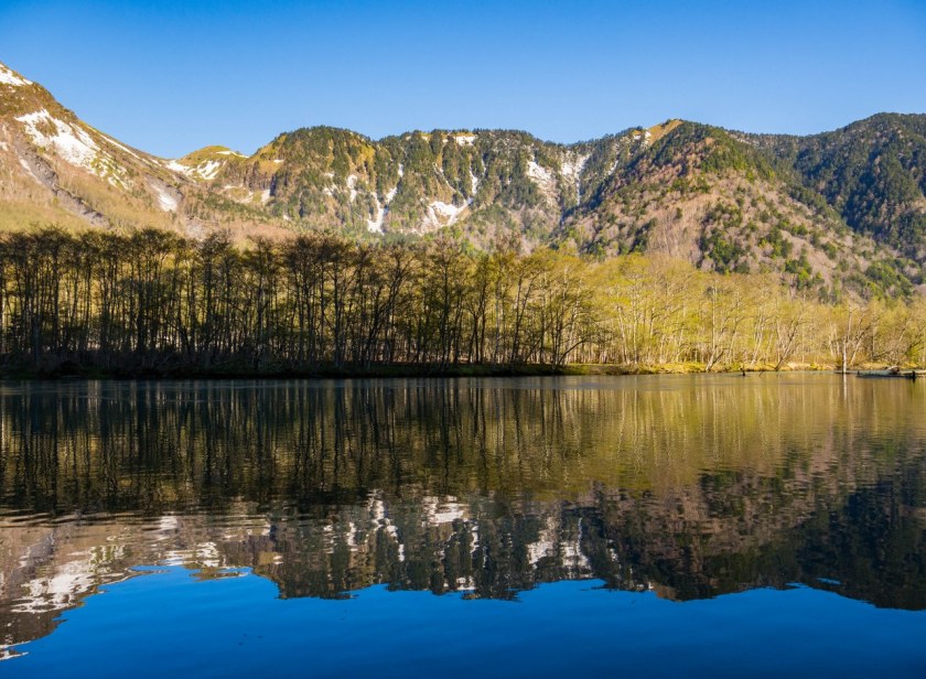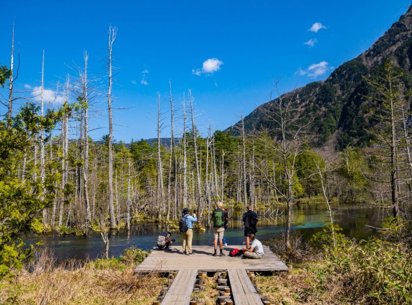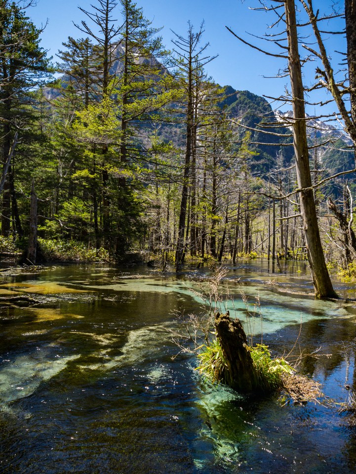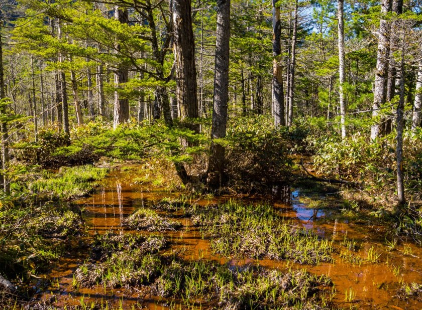 Staw Taisho i most Kappa dzieli niespełna 4 kilometry. Szlak jest łatwy i początkowo odbija od rzeki, prowadząc budzącym się do życia lasem. Maj jest bardzo wdzięcznym miesiącem jeśli chodzi o górskie wyprawy (wszędzie!), roślinność zaczyna nadrabiać stracony czas, tymczasem wyżej wciąż zalega śnieg – piękny to kontrast. Co prawda na podziwianie dolinnych delicji, kwitnących zawilców czy jabłoni było jeszcze za wcześnie, ale i tak świeża zieleń cieszyła oko. Całkiem spora część doliny jest podmokła i długimi fragmentami idzie się po różnorakich kładkach – ba, po zaledwie kilometrze las na chwilę się przerzedza robiąc miejsce sporym moczarom. Zwą się one Tashiro, podobnie jak niewielki, bardzo urodziwy staw ukryty w lesie – wystarczy skręcić w prawo i podejść kawałek. Jest bardzo prawdopodobne, że będzie on pierwszym z miejsc gdzie traficie na kolejkę do zrobienia zdjęcia xd Ja wolałem iść dalej, co zobaczyłem to zobaczyłem i w pamięci mi zostanie.