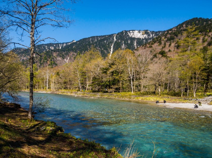 Kiedy szlak wraca nad rzekę, Azusa pierwszy raz pojawia się w swej klasycznej formie, nie rozlana jako staw a spokojnie spływającą z gór. I o rety, jakie to jest piękne, ic bjutiful – woda szmaragdowa acz przejrzysta, delikatny jej szum, śpiewające ptaszki, gdzieś w oddali dzwonki, ponownie. To te chwile, kiedy najmniej ekscytujące podejście i nudny kawał spaceru… mógłby trwać w nieskończoność. Powoli też na horyzoncie pojawiają się wszystkie najważniejsze elementy krajobrazu, niczym pionki na szachownicy zajmując przypisane im pola, most Kappa i wysokie nawet na 3000 metrów szczyty masywu Hotaka. Wszystko pięknie, tylko że…
