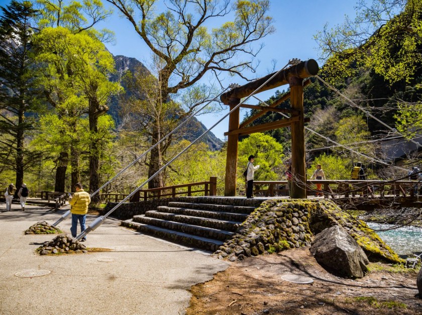 No, ale dobra, niezależnie od moich zapatrywań na kwestię hoteli to przewieszonemu nad rzeką mostowi nie można odmówić ikoniczności. Obecna przeprawa jest piątym wcieleniem Kappabashi, pierwotnie – o ile dobrze rozczytuję źródła – most był podnoszony, lecz od 1910 każda kolejna jego twarz jest już mostem wiszącym. Dziś wiszą też na nim turyści – wszyscy MUSZĄ zrobić sobie pamiątkowe zdjęcie. Nazwa mostu nawiązuje rzecz jasna do jednych z najbardziej znanych yokai japońskiego folkloru, kappy, złośliwych demonów pomieszkujących w okolicach zbiorników wodnych – dolina wraz z yokai (a także mostem) są bohaterami noweli „Kappa” słynnego Ryūnosuke Akutagawy i jeśli mistyczne stwory zaprawdę dolinę zamieszkiwały/ują to ciekawe jak zapatrują się na tysiące gości dziennie.