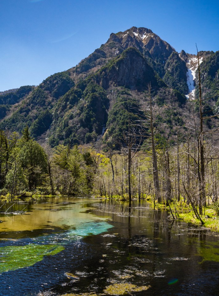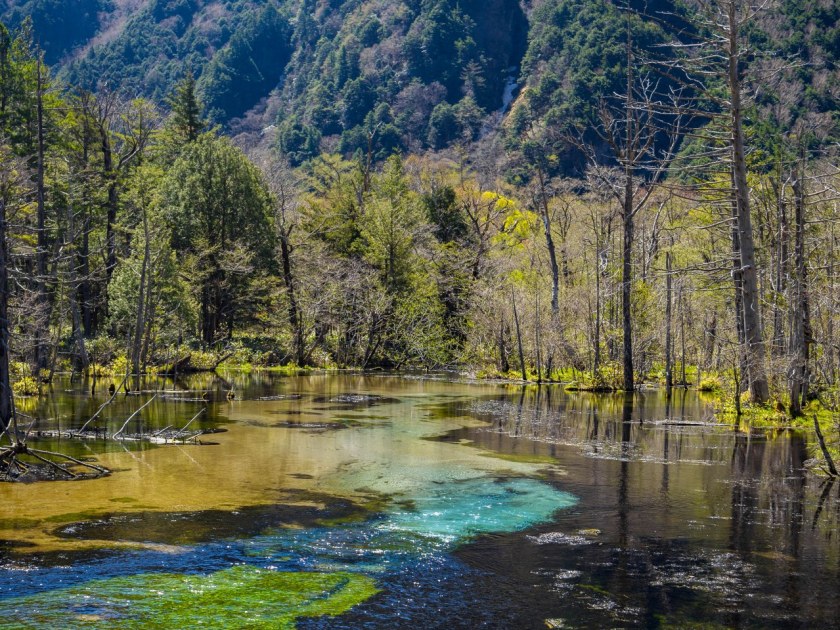 Zostawiając Most Kappa za sobą, żegnamy się z tłumami. W dalszą drogę ruszają niedobitki. Większość osób za cel obiera jednak położone dalej, kolejne stawy, wspinaczkę ku schronisku zaczynam sam. Nim to jednak nastąpi, warto zatrzymać się na mokradłach Dakesawa, chyba najbardziej niespodziewanym-a-kapitalnym przystanku na płaskościach doliny. Przezroczysta woda, zieleń mieszająca się z martwotą otaczających drzew, feeria barw dna rzeki i poszarpany szczyt góry Roppyaku pięknie się tu komponują.