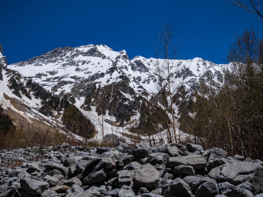Kiedy – w swojej pysze chyba xd -zaczynam myśleć, że tylko ja tego dnia wybrałem tę ścieżkę spotykam grupkę Francuzów. Dalsza droga do schroniska oraz późniejsze zejście do doliny obfitować będzie w wiele krótkich postojów i wymian uprzejmości z połową świata, od Chilijczyków po Australijczyków. Po chwili las zaczyna się rozrzedzać, równolegle do szlaku pojawia się olbrzymie ciągnące setki metrów rumowisko skalne, przez długą część tylko towarzyszy wspinaczce, w pewnym momencie trzeba pokonać jego kawałek by finalnie zacząć ostateczne podejście po wielgaśnym polu śnieżnym.