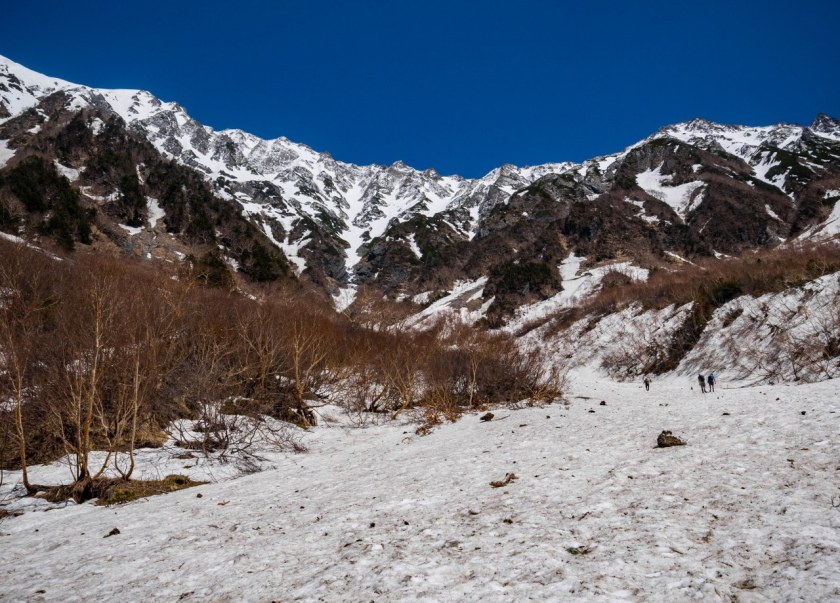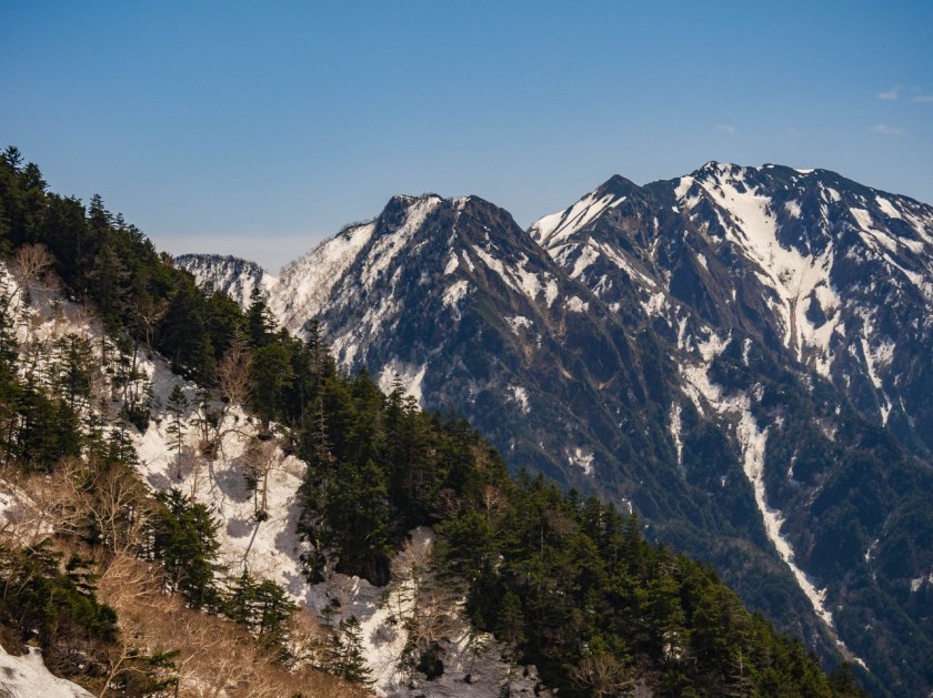 Temu ostatniemu, kamienisto-śnieżnemu podejściu towarzyszą najbardziej kapitalne, najbardziej panoramiczne widoki. Dolina z Azusą wydają się takie drobne, odległe szczyty Abo i Akandana czy też wzrastające tuż przed moim nosem, górujące nad schroniskiem skalne ściany masywu Hotaka pełne są jeszcze śniegu i dopiero za dobry miesiąc przyodzieją się w zielone, letnie barwy. Jest pięknie, ale i bardziej wymagająco, tak więc skupienie wskazane.