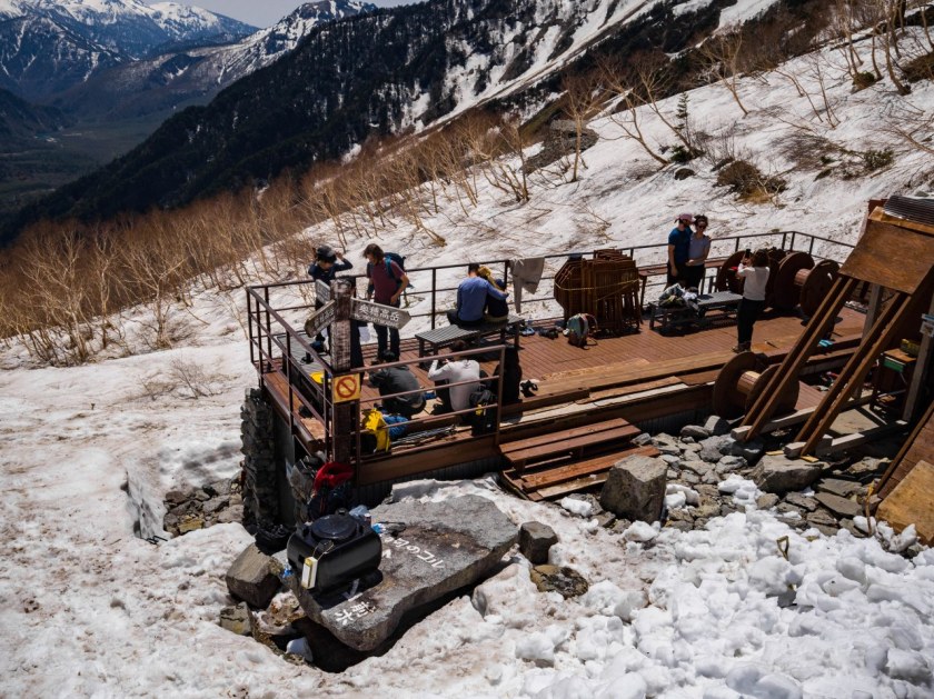 Latem, kiedy śnieg ze szlaków znika już całkowicie, a wy będziecie czuć się na siłach warto rozważyć nocleg, i trekking na któryś z okolicznych trzytysięczników, Okuhotaka, Mae-Hotaka czy Karasawę – z tego co czytałem, szlaki są jednak miejscami dość wymagające tak więc tu już lepiej wgłębić się w szczegóły. Równie dobrze, można też wtedy, co pewnie sam bym uskutecznił, władować się na instalowaną wówczas przed schroniskiem ławkę-huśtawkę 😀 Kurczę, pobujałbym się.