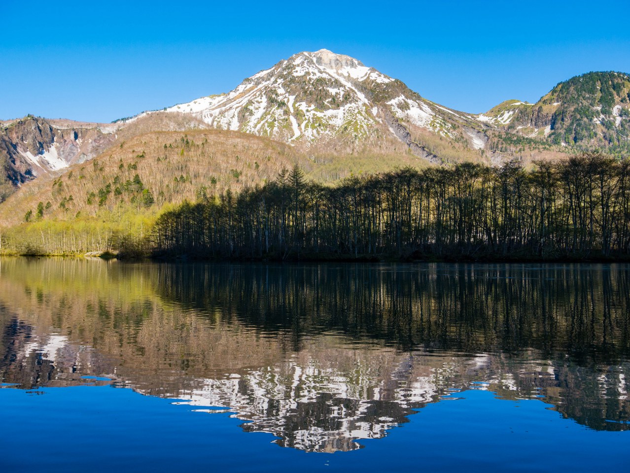 Staw Taisho służyć może za lustro, jednym z pięknie odbijających się w nim pagórów jest Yakedake, gagatek bez którego tak naprawdę nie odbywałby się ten spacer. Yakedake jest bowiem wulkanem i kilkanaście tysięcy lat temu, swymi wulkanicznymi ekscesami ukształtował znaczną część koryta Azusy, wprowadzając ją na salony, pomiędzy górskie szczyty. Co więcej, niewiele ponad sto lat temu, ponowna erupcja doprowadziła do spiętrzenia się rzeki i powstania stawu, tego nad którym stoimy. Po latach efekt katastrofy postanowiono wykorzystać i po dziś dzień staw ma również funkcję publiczną, służąc za zbiornik nieodległej elektrowni wodnej.
