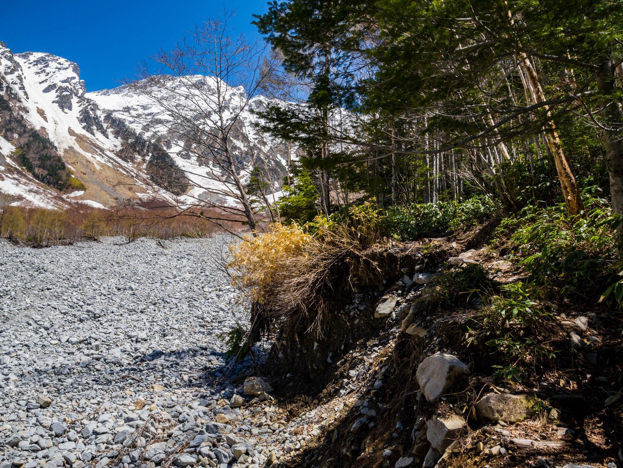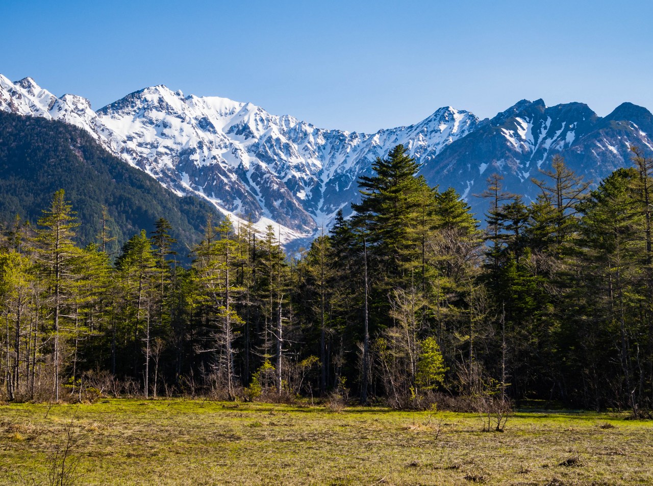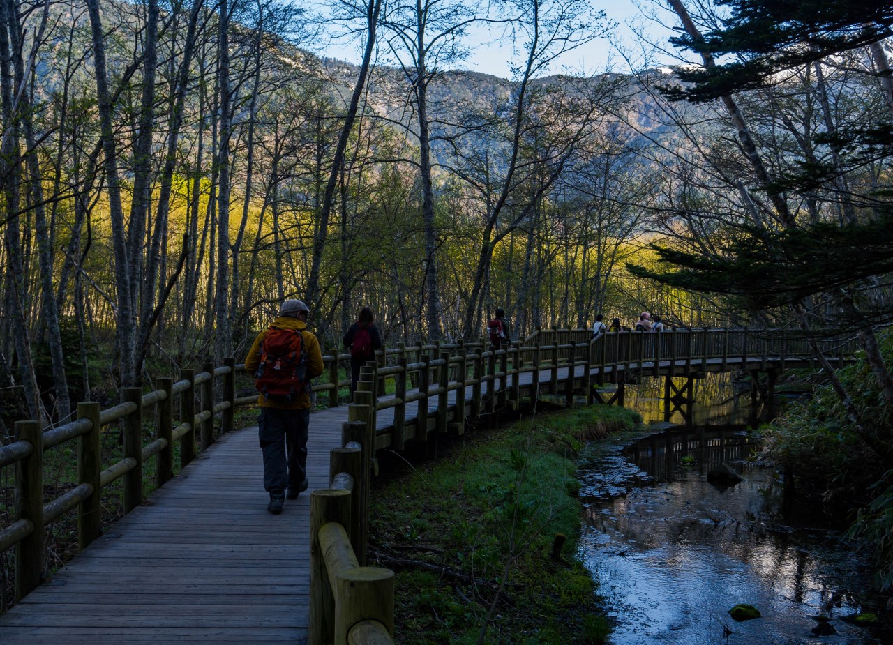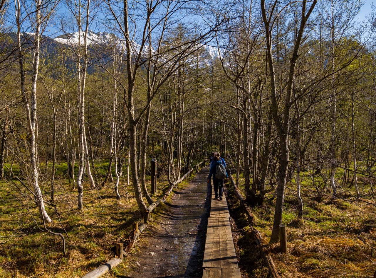 Staw Taisho i most Kappa dzieli niespełna 4 kilometry. Szlak jest łatwy i początkowo odbija od rzeki, prowadząc budzącym się do życia lasem. Maj jest bardzo wdzięcznym miesiącem jeśli chodzi o górskie wyprawy (wszędzie!), roślinność zaczyna nadrabiać stracony czas, tymczasem wyżej wciąż zalega śnieg – piękny to kontrast. Co prawda na podziwianie dolinnych delicji, kwitnących zawilców czy jabłoni było jeszcze za wcześnie, ale i tak świeża zieleń cieszyła oko. Całkiem spora część doliny jest podmokła i długimi fragmentami idzie się po różnorakich kładkach – ba, po zaledwie kilometrze las na chwilę się przerzedza robiąc miejsce sporym moczarom. Zwą się one Tashiro, podobnie jak niewielki, bardzo urodziwy staw ukryty w lesie – wystarczy skręcić w prawo i podejść kawałek. Jest bardzo prawdopodobne, że będzie on pierwszym z miejsc gdzie traficie na kolejkę do zrobienia zdjęcia xd Ja wolałem iść dalej, co zobaczyłem to zobaczyłem i w pamięci mi zostanie.