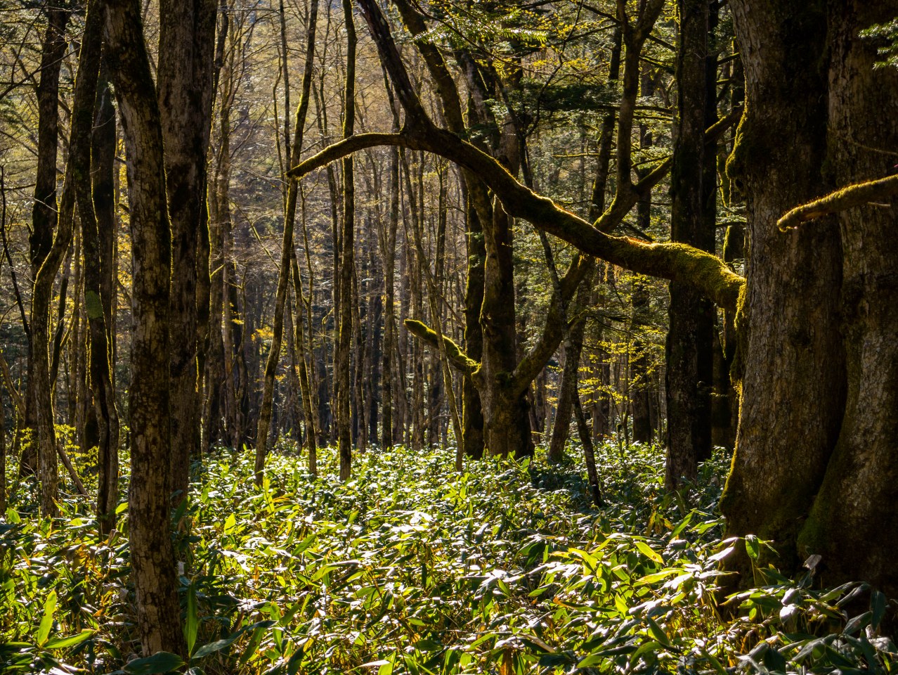 Zostawiając Most Kappa za sobą, żegnamy się z tłumami. W dalszą drogę ruszają niedobitki. Większość osób za cel obiera jednak położone dalej, kolejne stawy, wspinaczkę ku schronisku zaczynam sam. Nim to jednak nastąpi, warto zatrzymać się na mokradłach Dakesawa, chyba najbardziej niespodziewanym-a-kapitalnym przystanku na płaskościach doliny. Przezroczysta woda, zieleń mieszająca się z martwotą otaczających drzew, feeria barw dna rzeki i poszarpany szczyt góry Roppyaku pięknie się tu komponują.