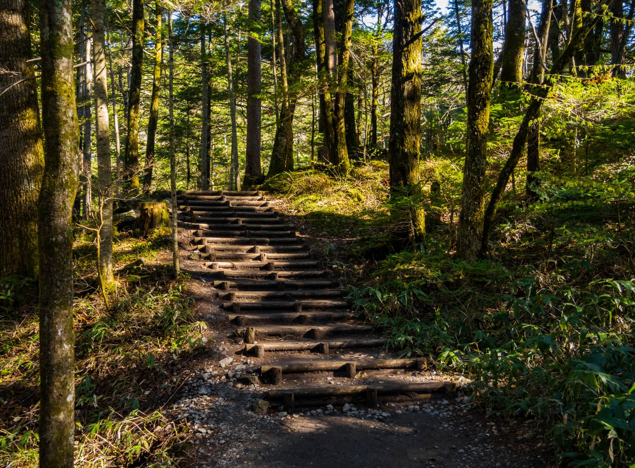 Faktyczne podejście do schroniska zaczyna się na rozejściu szlaków nieopodal – jeden prowadzi do kolejnych stawów, drugi odbija w las. Interesuje nas ten drugi. Do przejścia są trzy kilometry a 700 metrów przewyższenia rozkłada się miarowo, wystarczy złapać rytm i iść. Pierwsza część podejścia prowadzi przez arcyfajny las, ścieżka jest to kamienista, to błoniasta, to trzeba posiłkować się kładką. O taką japońską naturę nic nie robiłem!