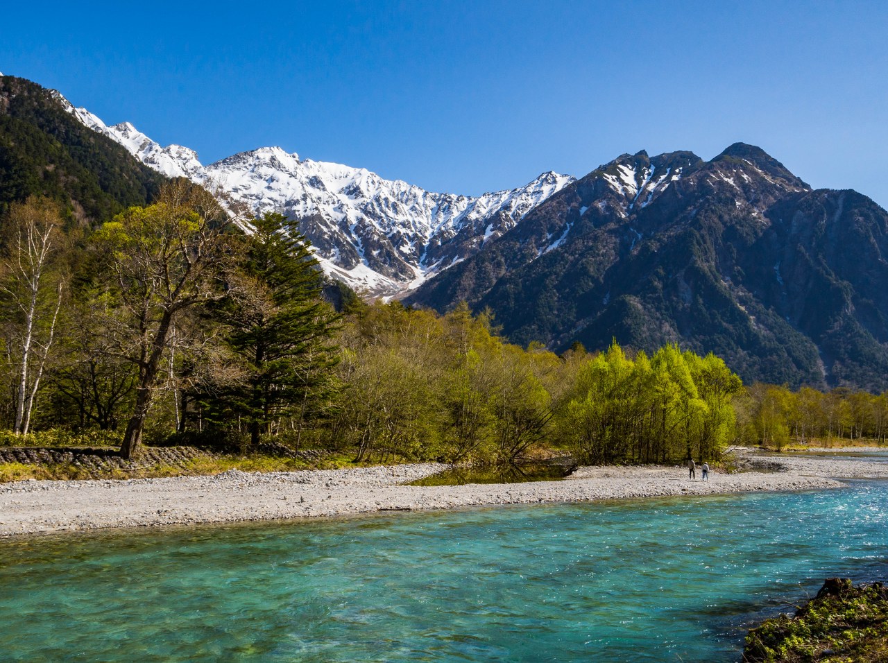 Kiedy szlak wraca nad rzekę, Azusa pierwszy raz pojawia się w swej klasycznej formie, nie rozlana jako staw a spokojnie spływającą z gór. I o rety, jakie to jest piękne, ic bjutiful – woda szmaragdowa acz przejrzysta, delikatny jej szum, śpiewające ptaszki, gdzieś w oddali dzwonki, ponownie. To te chwile, kiedy najmniej ekscytujące podejście i nudny kawał spaceru… mógłby trwać w nieskończoność. Powoli też na horyzoncie pojawiają się wszystkie najważniejsze elementy krajobrazu, niczym pionki na szachownicy zajmując przypisane im pola, most Kappa i wysokie nawet na 3000 metrów szczyty masywu Hotaka. Wszystko pięknie, tylko że…