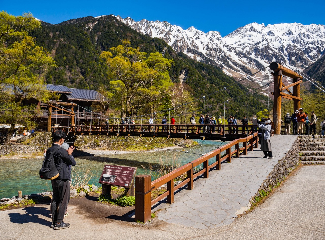 No, ale dobra, niezależnie od moich zapatrywań na kwestię hoteli to przewieszonemu nad rzeką mostowi nie można odmówić ikoniczności. Obecna przeprawa jest piątym wcieleniem Kappabashi, pierwotnie – o ile dobrze rozczytuję źródła – most był podnoszony, lecz od 1910 każda kolejna jego twarz jest już mostem wiszącym. Dziś wiszą też na nim turyści – wszyscy MUSZĄ zrobić sobie pamiątkowe zdjęcie. Nazwa mostu nawiązuje rzecz jasna do jednych z najbardziej znanych yokai japońskiego folkloru, kappy, złośliwych demonów pomieszkujących w okolicach zbiorników wodnych – dolina wraz z yokai (a także mostem) są bohaterami noweli „Kappa” słynnego Ryūnosuke Akutagawy i jeśli mistyczne stwory zaprawdę dolinę zamieszkiwały/ują to ciekawe jak zapatrują się na tysiące gości dziennie.