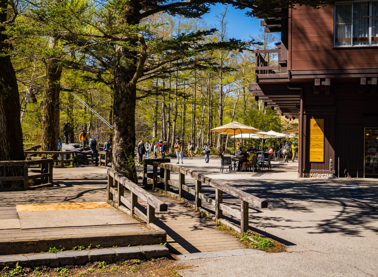 Wiecie co, podchodząc do Kappabashi przyszła pora na srogą rozminę. Bo dolina szczyci się tym, że jest car-free i tu rzeczywiście szacun, fajnie. Z drugiej jednak strony docierając w okolice mostu czułem taki zgrzyt, nie wiem do końca jak to określić. Powodem było zatrzęsienie hoteli po obu stronach rzeki, zdecydowanie odbierające temu fragmentowi sporo naturalności. Tak, wiadomo, że infrastruktura pomocna odwiedzającym, odpowiadająca na wielkie zainteresowanie tychże, jak najbardziej jest wskazana, ale jakoś tak momentami wydawało się, że opieka ta jest aż nadmierna. Biło mnie to trochę po oczach, bo prócz hoteli są i sklepy i restauracje – no nie da się zaprzeczyć, Kamikochi jest kurortem w sercu Parku Narodowego. Co ciekawe jednak – i to w pewnym stopniu mnie zaintrygowało – stan taki obowiązuje od lat. 50 XX-wieku i jest ustawowo regulowany: więcej niż 17 obiektów w dolinie nie powstanie i basta. Cóż, w pewnym stopniu jest to informacja w jakimś stopniu dająca nadzieję, że więcej ludzkiej ingerencji nie uświadczymy, i serio mam nadzieję, że postanowienie będzie się utrzymywało możliwie jak najdłużej. Bo nie wiem jak wy, ale sam wolałbym by było tu po prostu bardziej kameralnie, ot co.