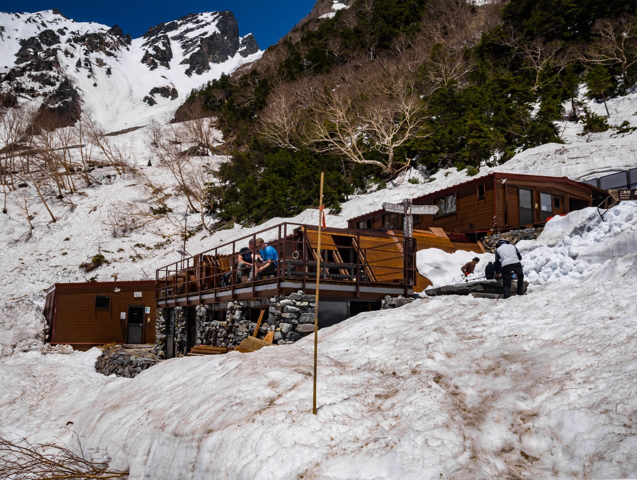 Dakesawa jest jednym z kilkunastu schronisk w Północnych Alpach Japońskich, i nie wiem jak w przypadku pozostałych, ale działo ono tylko w sezonie, od ostatniego tygodnia kwietnia do pierwszego tygodnia listopada. W zeszłym roku opady śniegu było obfite dlatego kwiecień i początek maja był dla pracowników schroniska wielce pracowity. Podczas tej wizyty niektóre mniejsze robótki wciąż trwały w najlepsze, kuchnia nie działała chyba jeszcze na najwyższych obrotach, ale pyszne curry czy zupka oden jak najbardziej były w menu. Kapitalną robotę w przedstawianiu życia i pracy w okolicznych schroniskach znajdziecie na blogu grupy Yarigatake, zarządzającej większością z nich.