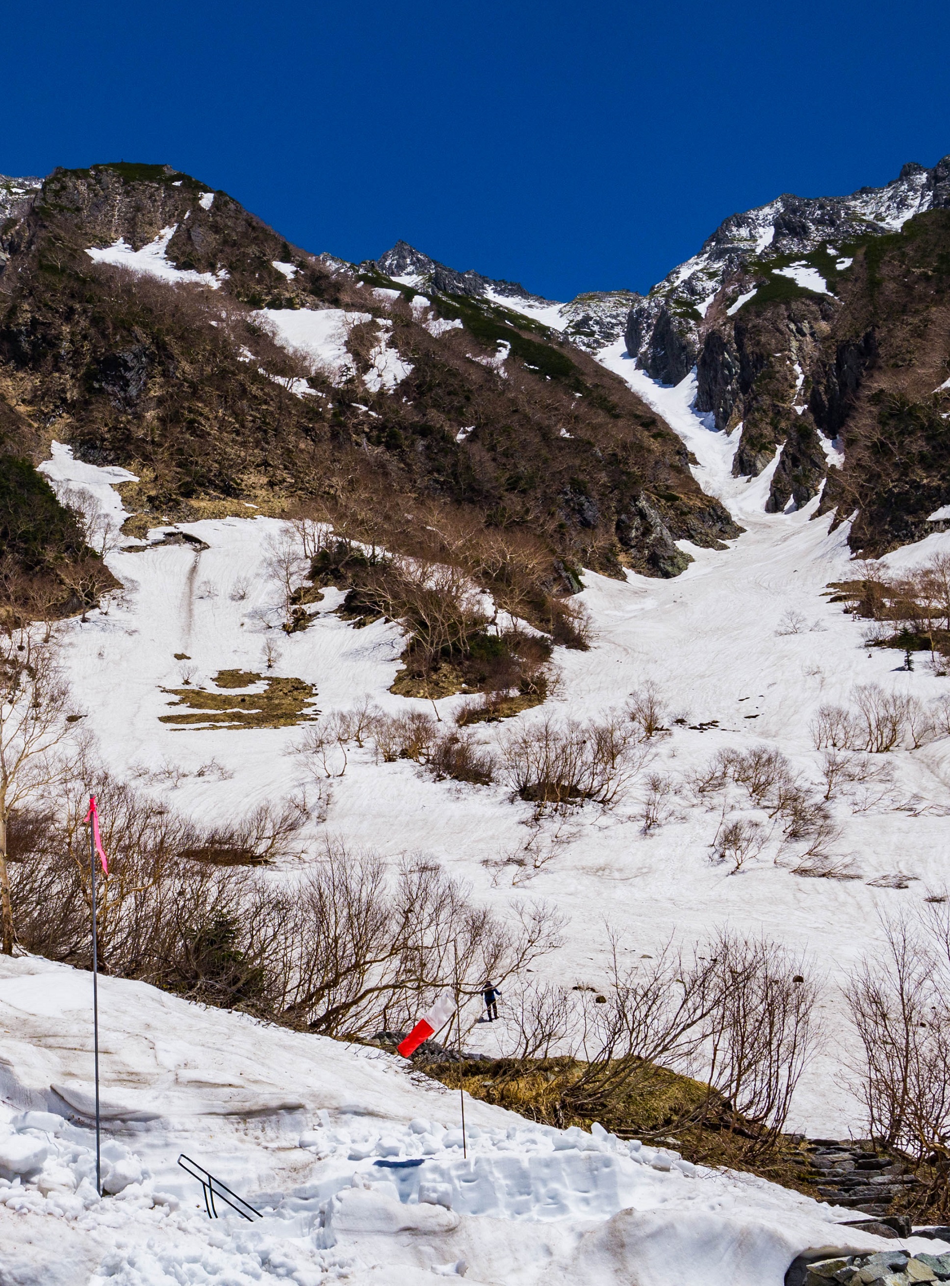 Temu ostatniemu, kamienisto-śnieżnemu podejściu towarzyszą najbardziej kapitalne, najbardziej panoramiczne widoki. Dolina z Azusą wydają się takie drobne, odległe szczyty Abo i Akandana czy też wzrastające tuż przed moim nosem, górujące nad schroniskiem skalne ściany masywu Hotaka pełne są jeszcze śniegu i dopiero za dobry miesiąc przyodzieją się w zielone, letnie barwy. Jest pięknie, ale i bardziej wymagająco, tak więc skupienie wskazane.