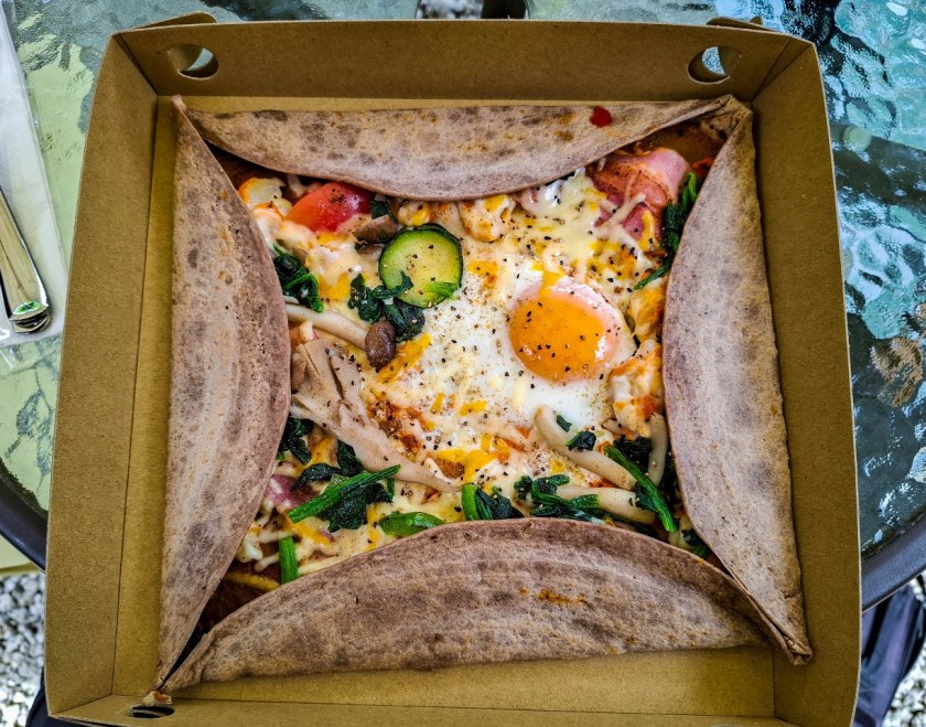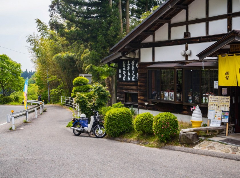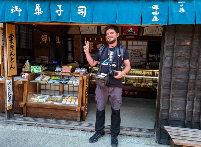 Zadbanych, historycznych domków jest w Tsumago lekko ponad 100 i mieszczą się w nich kawiarnie, pensjonaty, sklepiki z rękodziełem, restauracje. A w wielu po prostu ktoś mieszka. Spacerując między tymi drewnianymi cudeńkami, człowiek zachwyca się wszechobecną zielenią, nie tylko taką na drugim i dalszym planie, ale tą wyskakującą zza każdego winkla – kapitalna sprawa. Takie okoliczności przyrody wzmagają głód, dlatego warto zatrzymać się na małym co nieco. Na późne śniadanie świetnym miejscem okazała się kawiarnia Kojitsu, serwująca naleśniki galette – rzecz, wydawałoby się na wskroś zachodnią, ale dzięki mące gryczanej jak najbardziej tutejszą. Porcje solidne, bardzo 😀 Zaraz po sąsiedzku macie Sawadaya, sklep ze słodyczami nie byle jakimi, bo między innymi opartymi na specjalności doliny Kiso, kasztanach w formie ciasteczka kuri kinton – nie wiedziałem czego się spodziewać a dostałem pychotkę. Choć specyficzną.