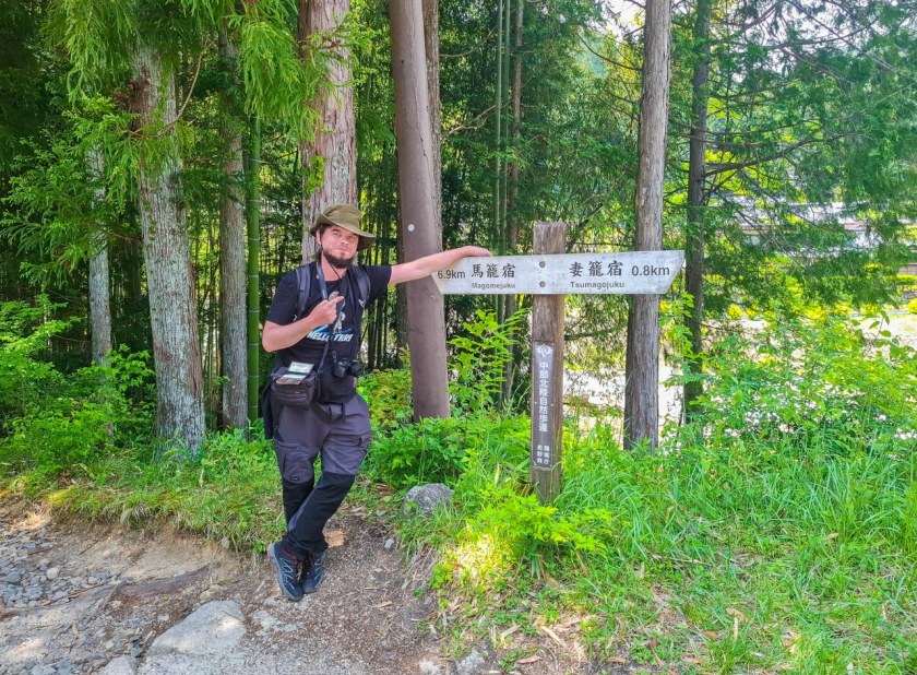 Z tego co zauważyłem, większość przybywających do doliny Kiso swój spacer pomiędzy Tsumago i Magome zaczyna w tym drugim miasteczku. Powody są dwa, dość oczywiste – po pierwsze szybsze i łatwiejsze dotarcie (z Nagoi), po drugie wędrówka jest prostsza, do najwyższego punkty na przełęczy Magome są zaledwie 2 kilometry a potem długie, lekkie zejście. Idąc z Tsumago, te 6 kilometrów idzie się nieustannie pod górkę, nie jest to jednak żadna męcząca wspinaczka: Tsumago (430mnpm) ->6km -> Przełęcz Magome (najwyższy punkt na szlaku 809mnpm) -> 2km -> Magome (570mnpm).