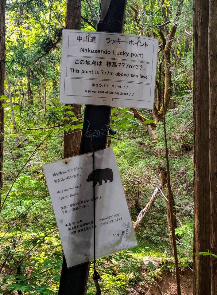 I nie chodzi tu o smaczne jedzenie i chłodne piwo, które przy coraz wyższej temperaturze było jak znalazł. Nie, największym plusem przybytku byli jego właściciele (i ich znajomi, i inni odwiedzający), niezwykle sympatyczni i z sercem na dłoni. Okazało się bowiem, że ruszając dalej zostawiłem tam plecak, i o fakcie zorientowałem się prawie godzinę później na stromych uliczkach Magome. Wtedy nie wiedziałem jeszcze, że plecak został w zajeździe, ale tak przypuszczając ruszyłem z powrotem. Niestety by do zajazdu wrócić trzeba pokonać najbardziej stromy fragment szlaku. Kiedy zziajany dotarłem na miejsce okazało się, że moim plecakiem nie dość, że się zaopiekowano to dodatkowo na miasto wysłano kilka osób, których zadaniem było znalezienie mojej skromnej osoby. Wysłani na poszukiwania znajomi zostali poinformowani o moim powrocie, ale każdy z nich podjechał z powrotem do zajazdu by z uśmiechem na twarzy uścisnąć mi dłoń. Widząc pot ściekający mi z czoła napojono mnie chyba litrem wody a pokłonom, podziękowaniom i uśmiechom nie było końca – w całym tym zamieszaniu, ze stresu chyba, nawet mój początkujący japoński był zaskakująco płynny i chyba zrozumiały xd. No kurczę, wiadomo, że to przykład anegdotyczny, ale absolutnie wpisujący się w obraz Japonii jako kraju, gdzie zgubić coś nie oznacza stracić to bezpowrotnie.