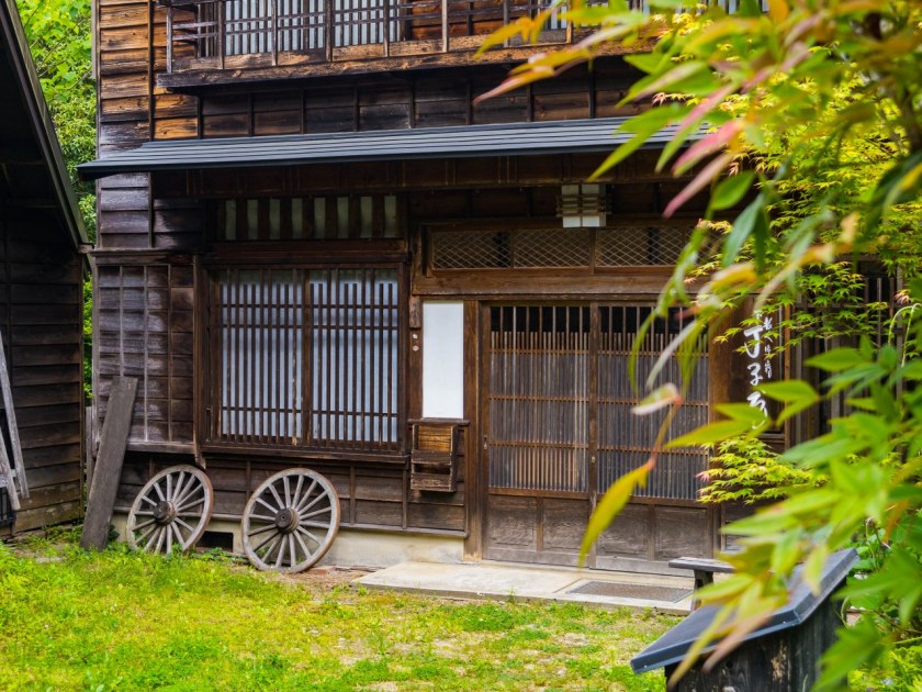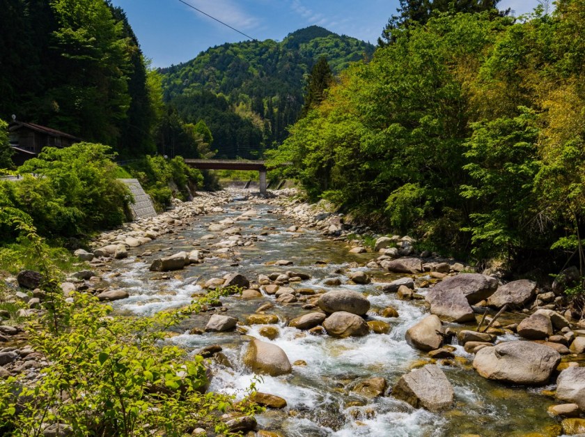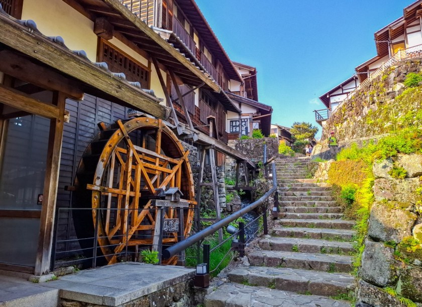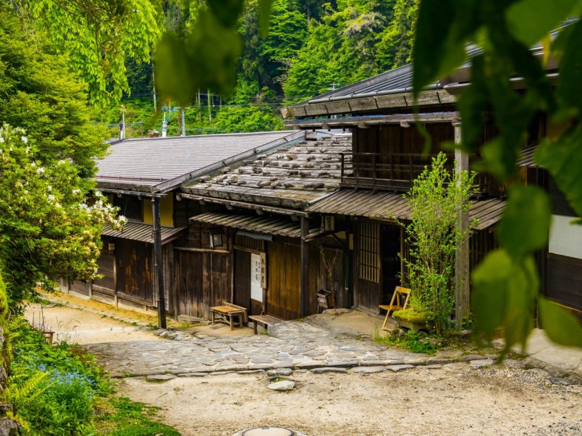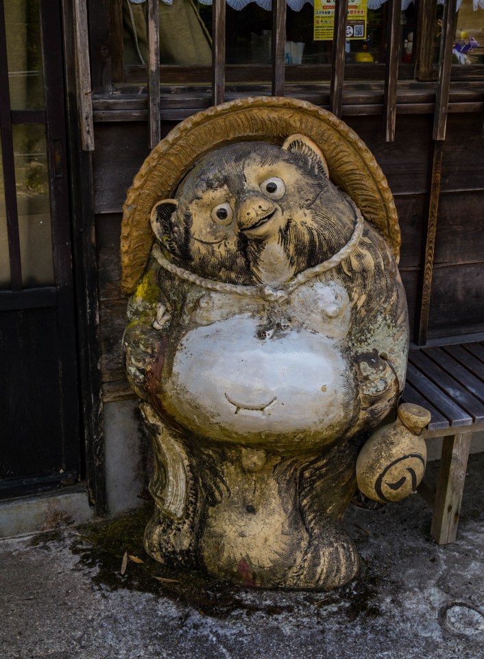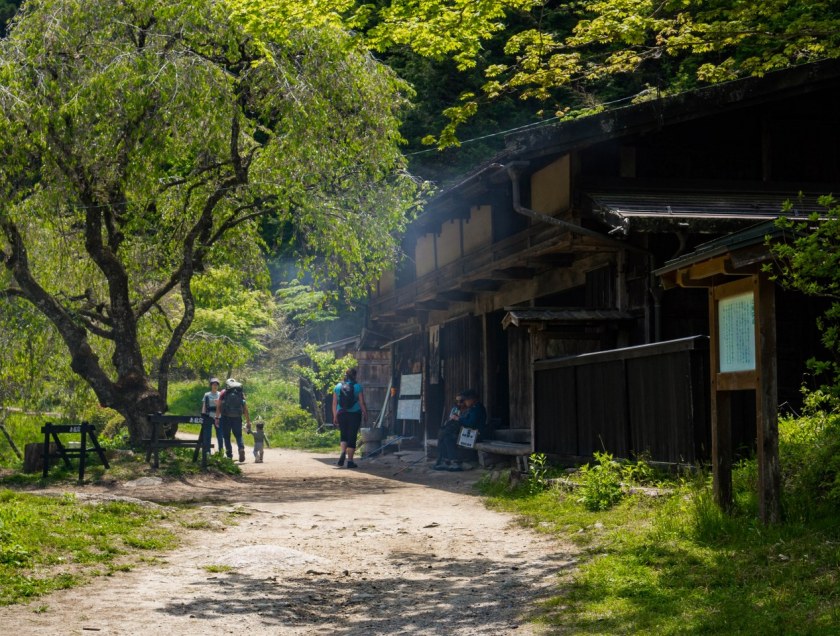 Z Tsumago żegnamy się nad rzeką Araragi, tanuki przy jednym z mijanych domków odprowadza nas wzrokiem mówiącym „Widać po mnie?”. Araragi jest dość żywiołową rzeką, zasila wiele malutkich młynów jak i nieodległą elektrownię. Kawałek od centrum trafiają się budynki lekko zapuszczone, kilka nawet opuszczonych – zapewne, któreś z nich można odkupić za bezcen (a potem wydać już niezłą sumkę na przywrócenie do życia).