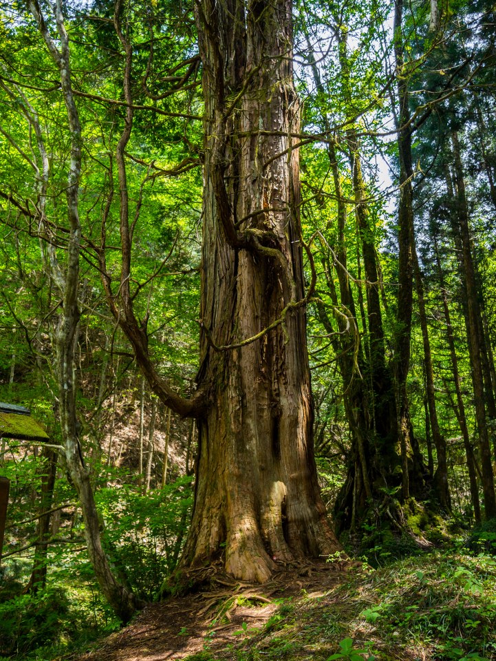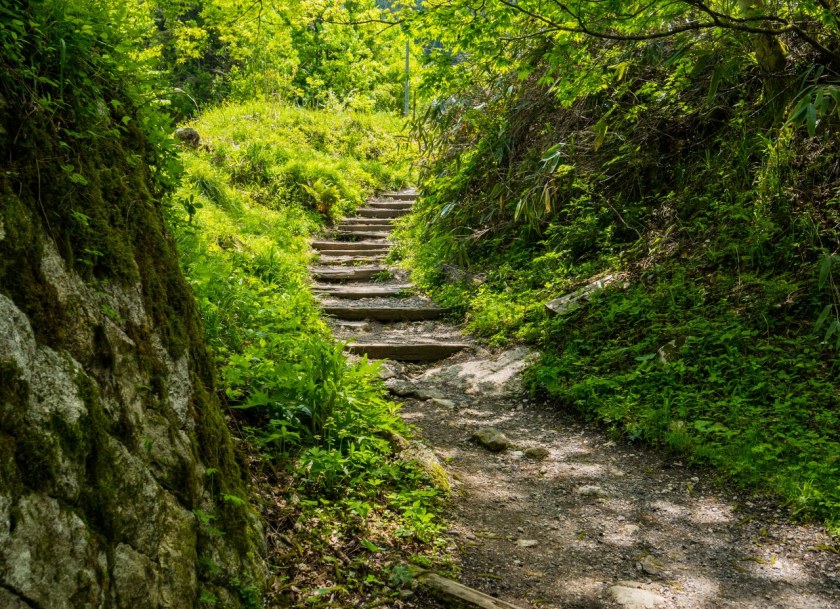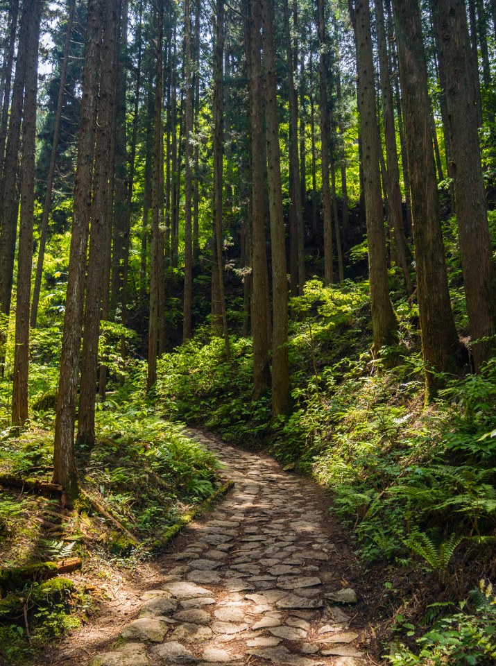 Tuptanie jest przyjemne, choć na koniec asfaltu trzeba czekać całe 2 kilometry. W ramach rekompensaty odcinek odbijający w las okazuje się być najbardziej kapitalnym – wijąca się kamienna, zadbana ścieżka jako żywo daje namiastkę tego jak szlak mógł wyglądać dawniej. Cedry, cyprysiki groszkowe sawara, tuje japońskie i sosny w swym naturalnym środowisku wzrastają nawet i na 40 metrów a swoje miejsce pomiędzy iglakami znajdują też bambusy czy ostatnie kolorowe wciąż wisterie.