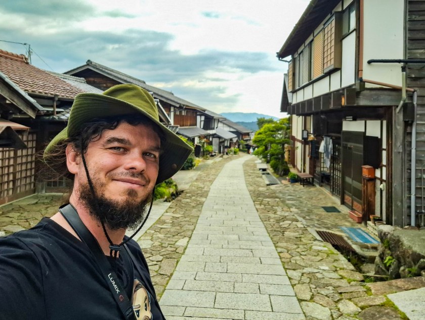 Cóż, nocując w Matsumoto wybrałem opcję porannego pociągu do Nagiso, skąd po kilkunastu minutach autobusem podjechałem do Tsumago. Był piękny, pochmurny poranek, na ulicach pustki, idealne warunki na rozpoczęcie spokojnego spaceru po miasteczku. A potem 8 kilometrowego, leciutkiego trekkingu do Magome.