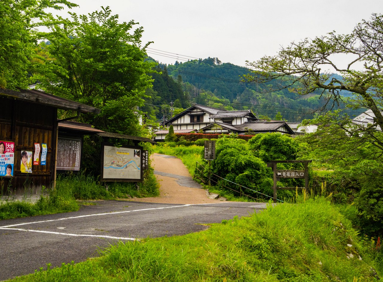 Choć chciałoby się by ścieżka przez las się nie kończyła to ostatecznie czeka nas powrót na asfalt. W taki sposób dociera się do przełęczy Magome, po minięciu, której żegnamy się z prefekturą Nagano, witając prefekturę Gifu. To najwyższy punkt na tym odcinku szlaku, i znak, że stacja Magome już tuż tuż. A przynajmniej jej pierwsze chatki. I shintoistyczny chram, i młyn.