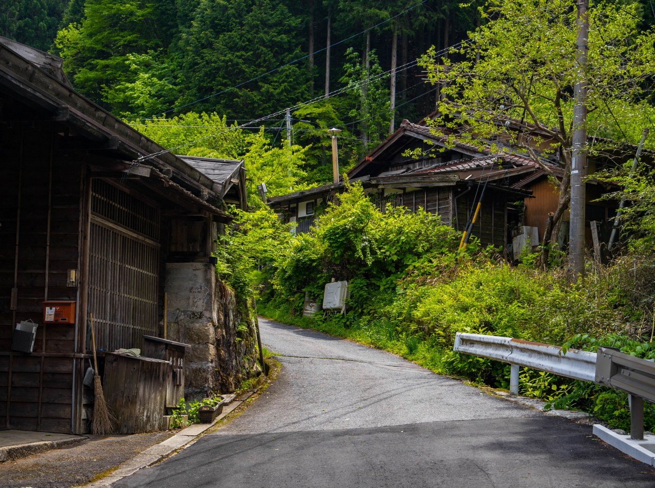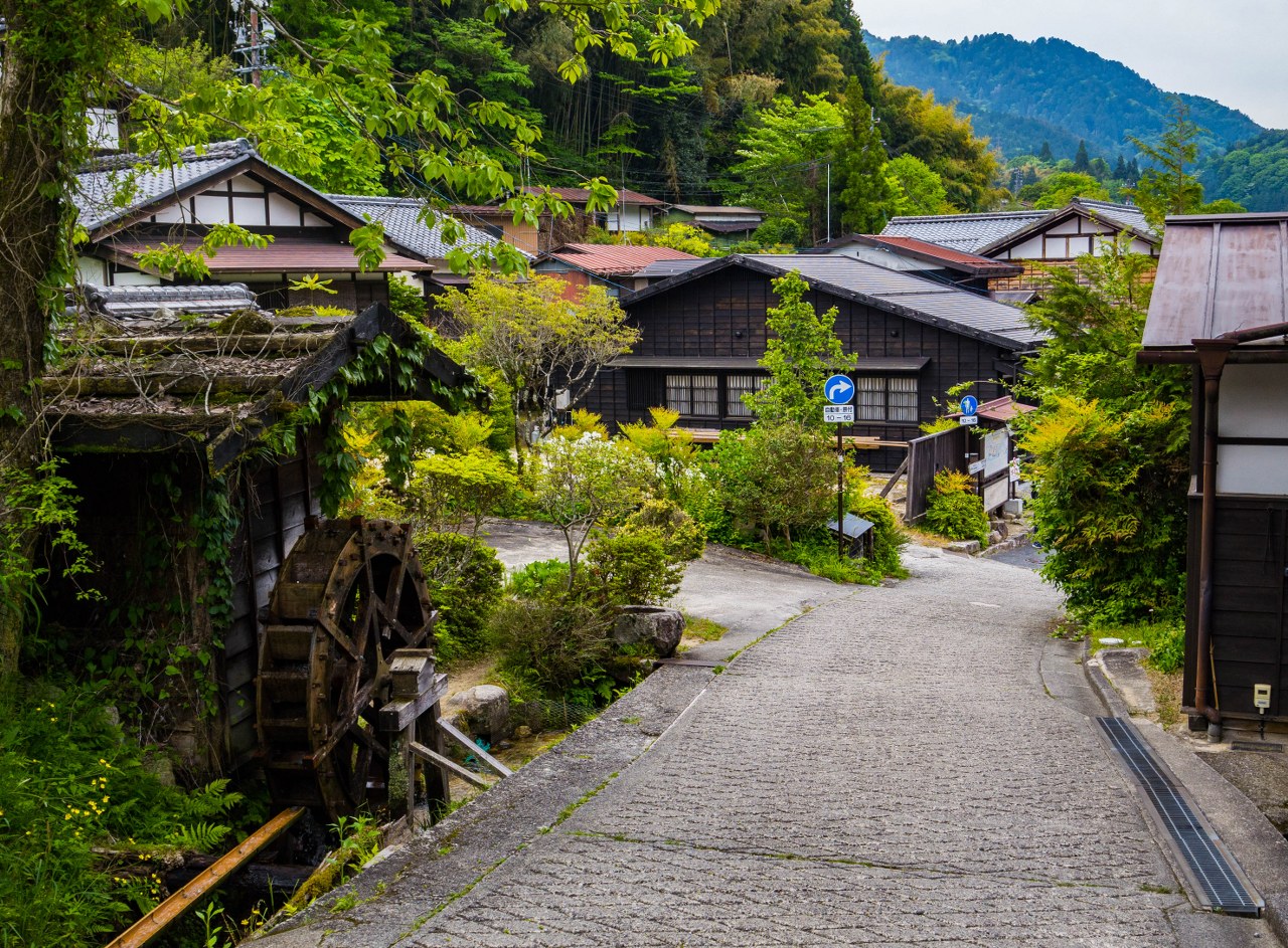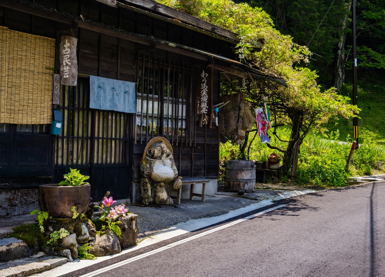 Z Tsumago żegnamy się nad rzeką Araragi, tanuki przy jednym z mijanych domków odprowadza nas wzrokiem mówiącym „Widać po mnie?”. Araragi jest dość żywiołową rzeką, zasila wiele malutkich młynów jak i nieodległą elektrownię. Kawałek od centrum trafiają się budynki lekko zapuszczone, kilka nawet opuszczonych – zapewne, któreś z nich można odkupić za bezcen (a potem wydać już niezłą sumkę na przywrócenie do życia).