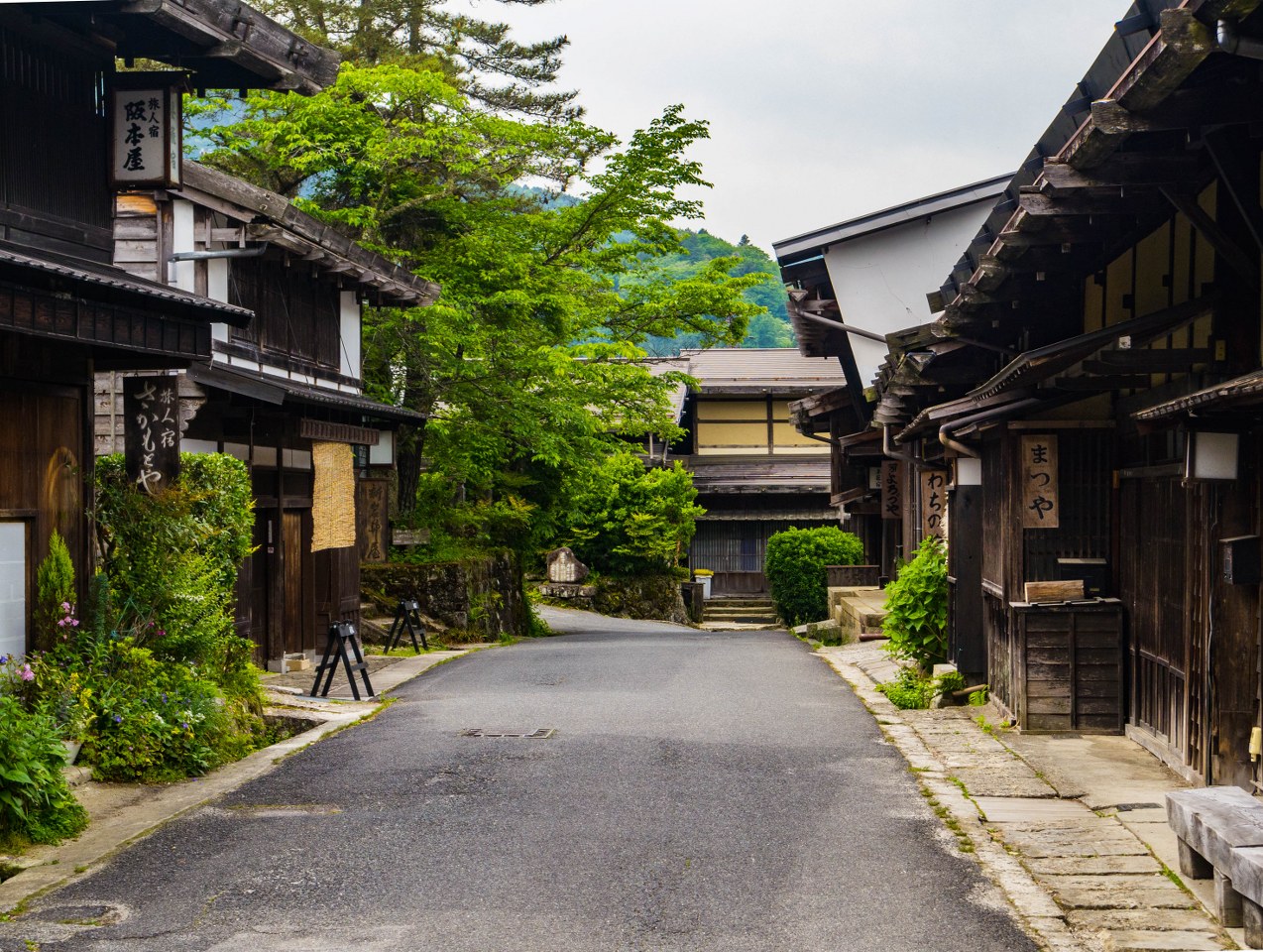 Cóż, nocując w Matsumoto wybrałem opcję porannego pociągu do Nagiso, skąd po kilkunastu minutach autobusem podjechałem do Tsumago. Był piękny, pochmurny poranek, na ulicach pustki, idealne warunki na rozpoczęcie spokojnego spaceru po miasteczku. A potem 8 kilometrowego, leciutkiego trekkingu do Magome.