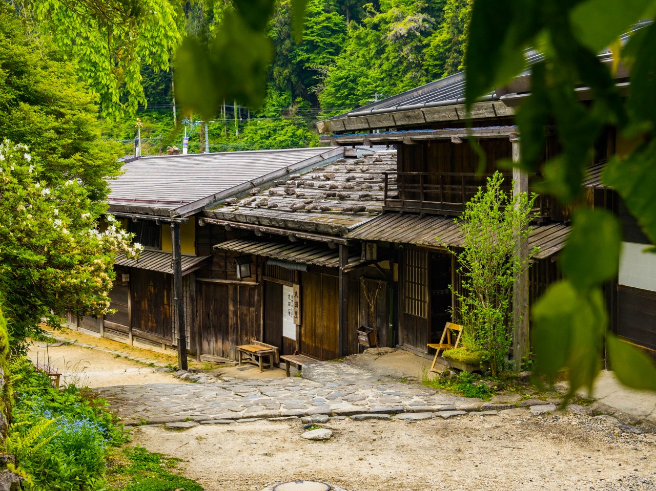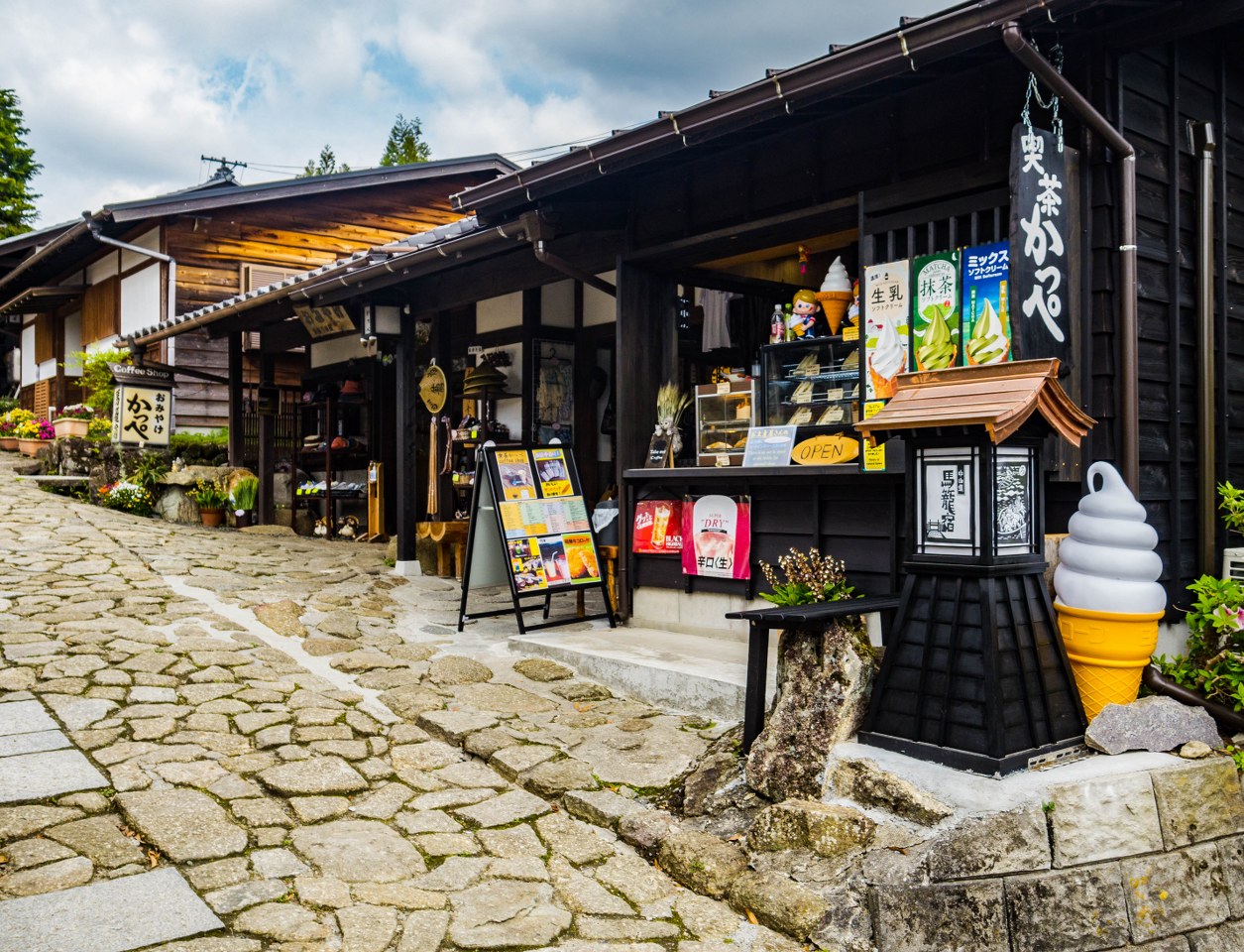 Zadbanych, historycznych domków jest w Tsumago lekko ponad 100 i mieszczą się w nich kawiarnie, pensjonaty, sklepiki z rękodziełem, restauracje. A w wielu po prostu ktoś mieszka. Spacerując między tymi drewnianymi cudeńkami, człowiek zachwyca się wszechobecną zielenią, nie tylko taką na drugim i dalszym planie, ale tą wyskakującą zza każdego winkla – kapitalna sprawa. Takie okoliczności przyrody wzmagają głód, dlatego warto zatrzymać się na małym co nieco. Na późne śniadanie świetnym miejscem okazała się kawiarnia Kojitsu, serwująca naleśniki galette – rzecz, wydawałoby się na wskroś zachodnią, ale dzięki mące gryczanej jak najbardziej tutejszą. Porcje solidne, bardzo 😀 Zaraz po sąsiedzku macie Sawadaya, sklep ze słodyczami nie byle jakimi, bo między innymi opartymi na specjalności doliny Kiso, kasztanach w formie ciasteczka kuri kinton – nie wiedziałem czego się spodziewać a dostałem pychotkę. Choć specyficzną.