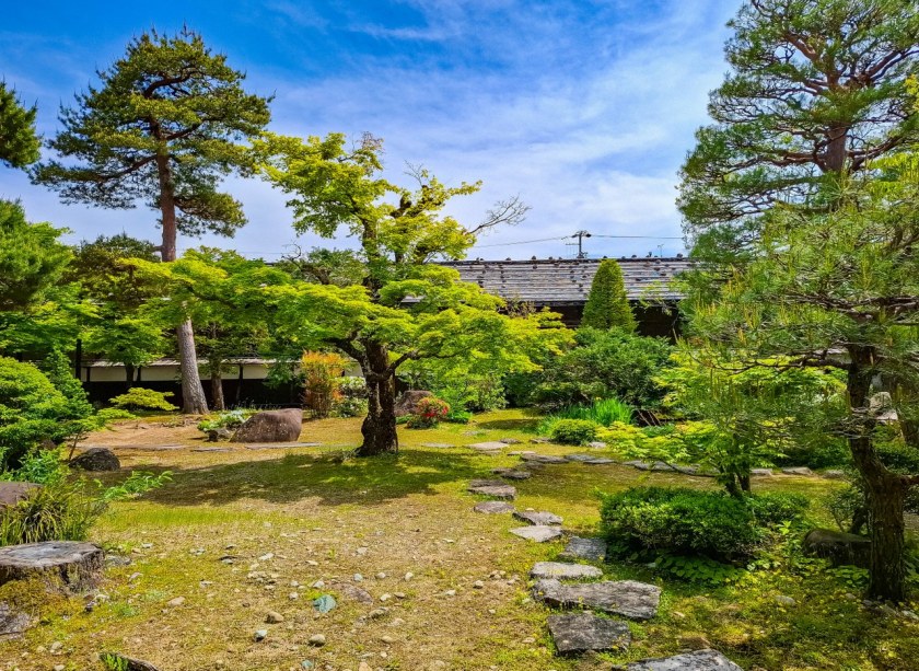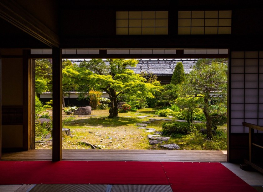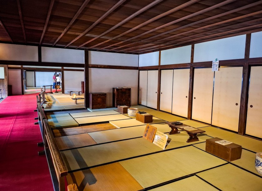 Zwiedzania feudalnych posiadłości nigdy dość i również tutaj czułem się jak ryba w wodzie. Kompleks jest sporawy, składa się nań budynek główny, piękny japoński ogród i jeden z największych w Japonii spichlerzy na ryż, służący dziś za halę wystawową. Główny budynek zaskakuje wielkością, ilością pomieszczeń i tym, że kiedy już wydaje się, że trafiło się do ostatniego to pojawia się wąskie przejście do kolejnego. Chowając buty do siatki/plecaka spacerujemy po drewnianych podłogach i matach tatami podziwiając drewnianą konstrukcję, zaglądamy do miejsc pracy zarządcy, sędziego i innych urzędników (z jakiegoś powodu największe szychy miały dostęp do widoku na ogród), ich komnat, kuchni, aresztu (przyjrzyjcie się koszowi na… przestępcę), no i przede wszystkim wracamy na skraj ogrodu, siadamy i kontemplujemy piękny widok.