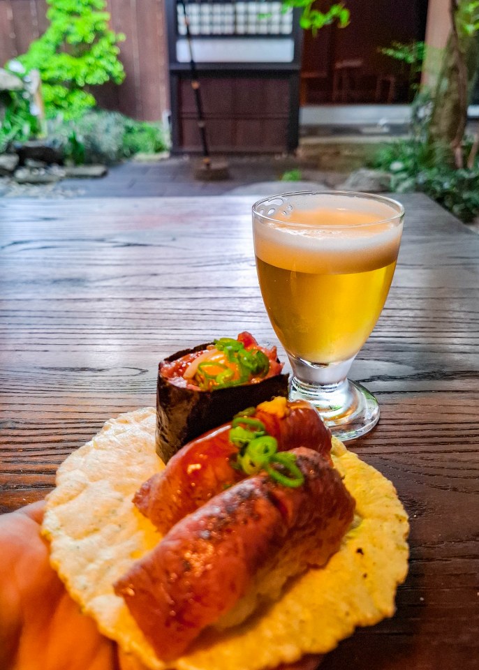 Najsłynniejszym kulinarnym specjałem prowincji Hida jest tamtejsza rozpływająca się w ustach wołowina, Hida-gyu, podobnie jak u słynniejszego krewnego z Kobe, o marmurkowej teksturze, i wybitnych walorach smakowych, zaliczana do tych tak jakby luksusowych. A przy tym – tak mi się zdaje – o wiele łatwiejsza w „zdobyciu”. W wielu knajpkach i restauracjach znajdziecie ją nie dość, że w najwyższej klasie A5 to i za całkiem przyzwoite pieniądze. Ja polecam lokal Hida Kotte Ushi, sam w sobie już piękny, z kapitalnym wnętrzem i małym ogrodem – wołowinę dostaniecie tam w postaci nigiri, oraz mini tatara choć tak naprawdę gunkan sushi. Nigiri serwowane jest na krakersach ryżowych, maźnięte sosem sojowo-imbirowym i posypane solą. Pychota, za 1200 jenów.