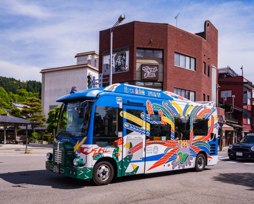 Muzeum i dworzec dzielą 3 kilometry i odległość tę najłatwiej pokonać jednym z miejskich busików. Część z nich oklejona jest tematycznymi grafikami a trzy linie Takumi jako żywo nawiązują do matsuri i kilku elementów nań się składających – busik-lew z tańca Shishimai jest wspaniały. Do muzeum jeździ linia Sarubobo i po drodze zahacza ona o jeszcze jedno, niezwykle ciekawe miejsce, Hida no Sato, czyli muzeum etnograficzne, skansen przedstawiający zabytkową, ludową architekturę prefektury Gifu – wizytę w skansenie polecam wam szczególnie, jeśli nie planujecie wyprawy do słynnej wioski Shirakawa-go.